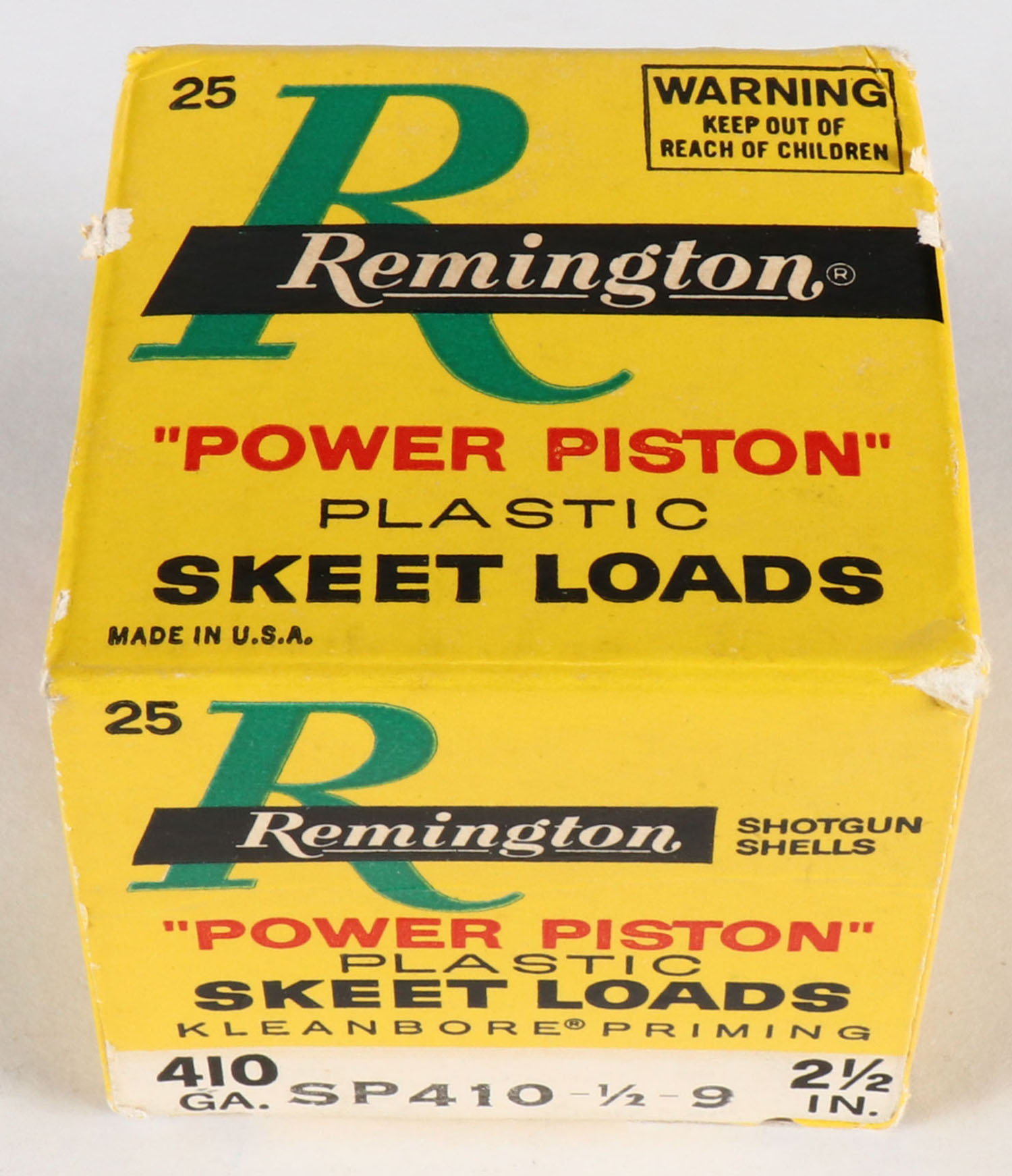 Remington, Skeet Loads, ''Power Piston'', 410ga., 2 1/2'', 1pc., Full, shot size 9, yellow, black & green box, box is very solid, plastic shells are very good. Grade: Very Good ++ - Value: 10 to 40
