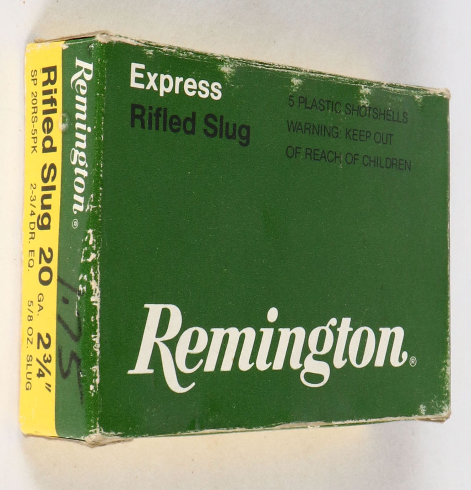 Remington, Express, 20ga., 1pc., Full, shot size Rifled Slug, multi-colored box, plastic shells are excellent. Grade: Very Good ++ - Value: 8 to 20