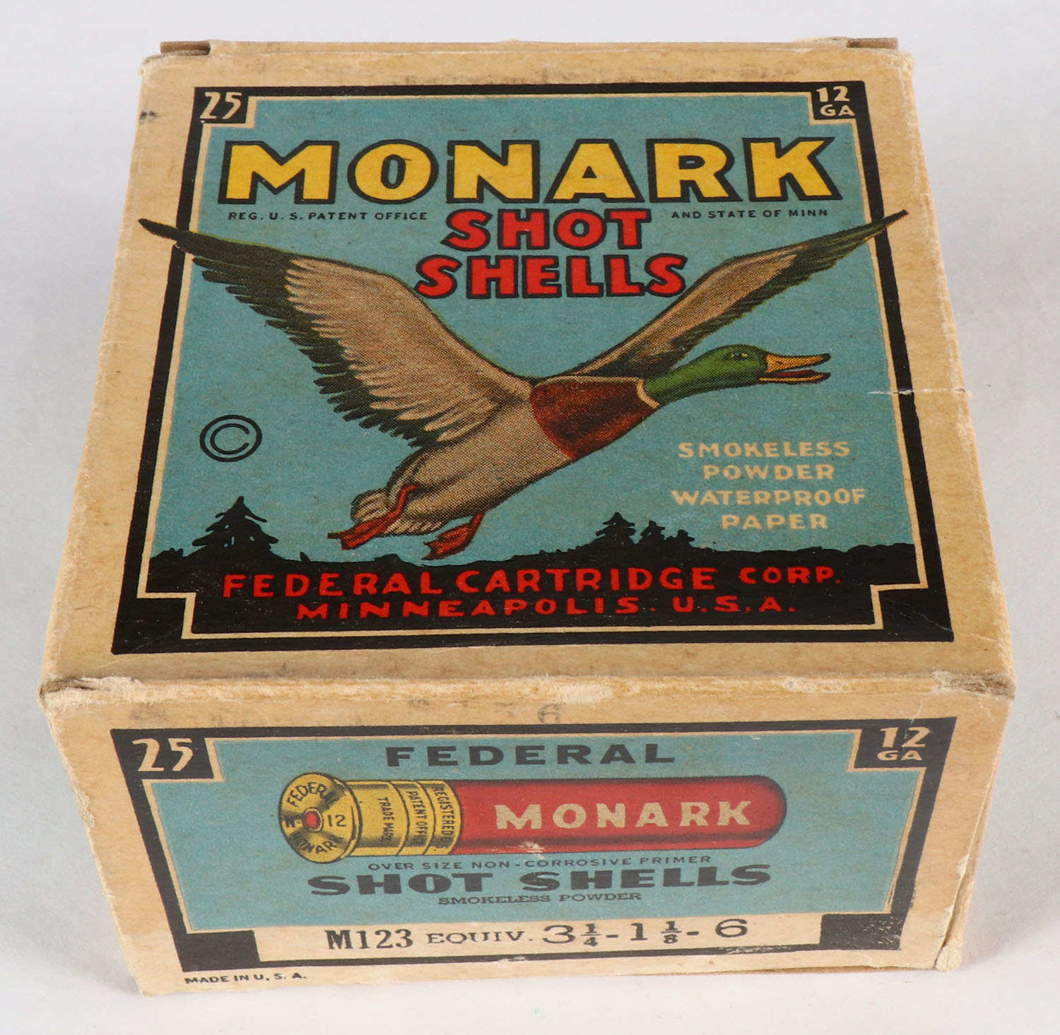 Federal Cart. Co., MONARK, 12ga., 1pc., Partial 20rds., shot size 6, Black border, blue, yellow and red box with flying mallard, box has light age soiling & scuffing, paper shells are very good. Grade: Very Good ++ - Value: 10 to 40