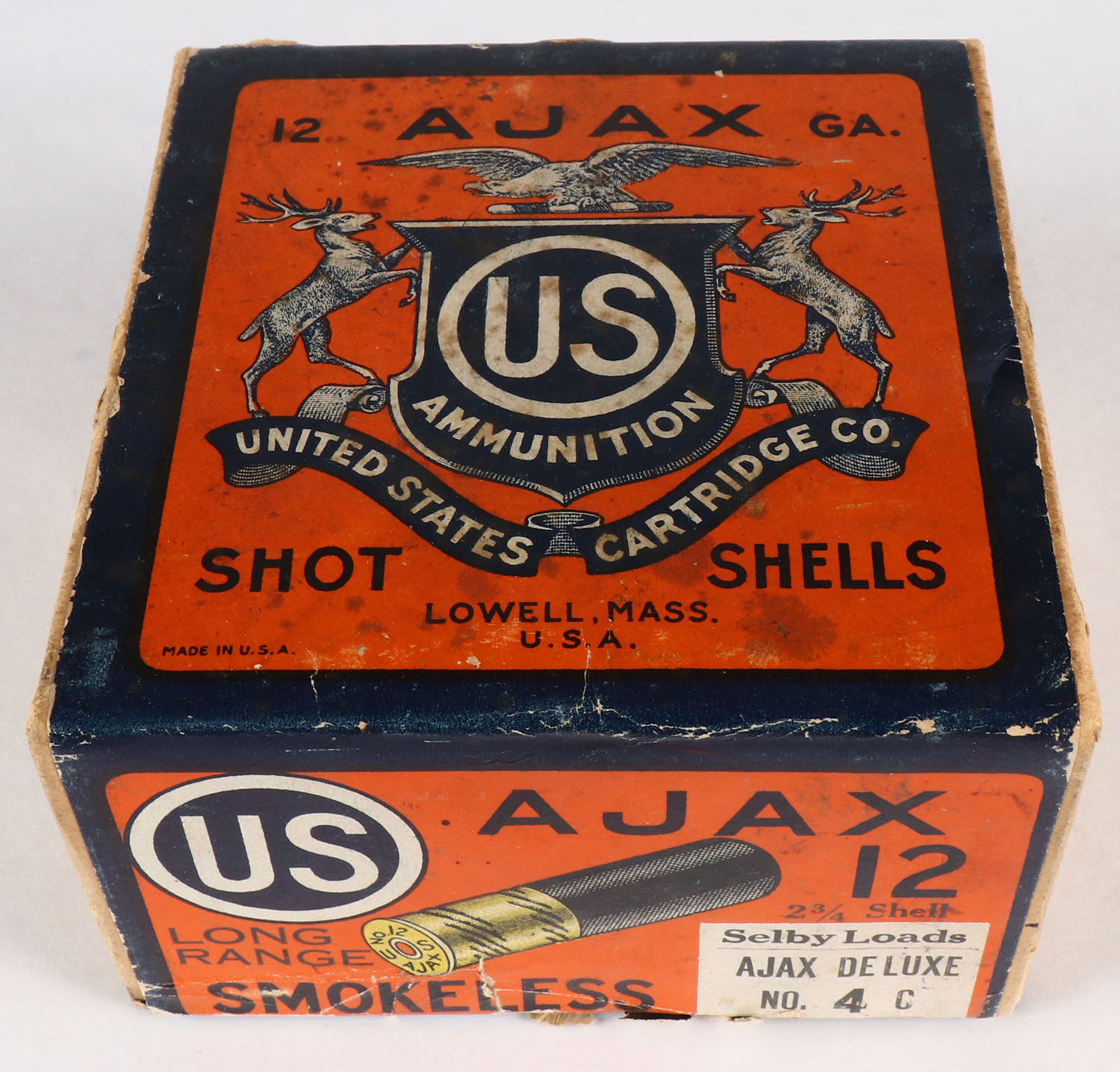US Cart. Co., Lowell, Mass, Ajax, 12ga, 2pc., Empty, shot size 4C, buff box orange, blue & white label, box has light age soiling & edge wear with great colors. Grade: Very Good ++ - Value: 20 to 60