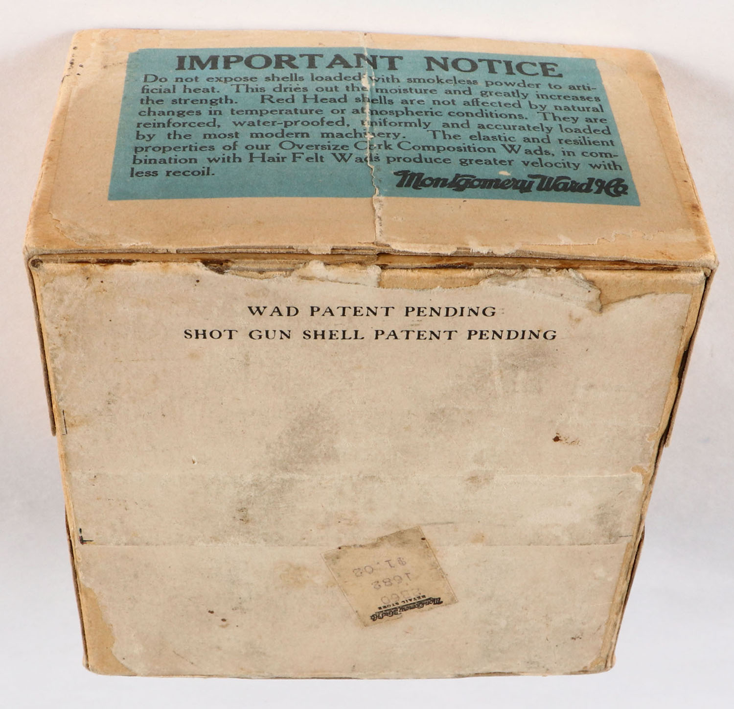 Montgomery Ward & Co., Red Head, Dreadnaught Oval, Has Early Side label, 12ga., 2pc., Empty, shot size 4ch, buff box with multi colored scene & two geese flying, box has light scuffing & light soiling with great colors. Grade: Very Good ++ - Value: 40 to 100