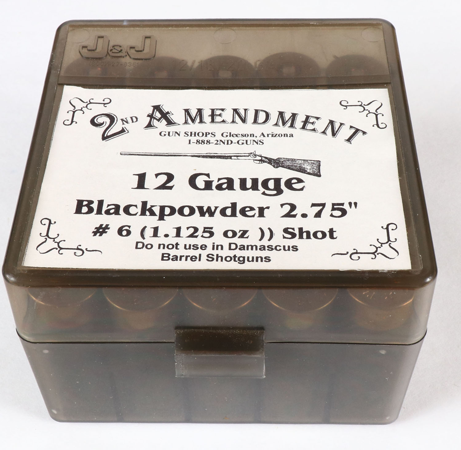 2nd Amendment, Black powder, 12ga., 1pc., Full, shot size 6, black plastic case with white & black label, shells are excellent. Grade: Excellent + - Value: 10 to 30