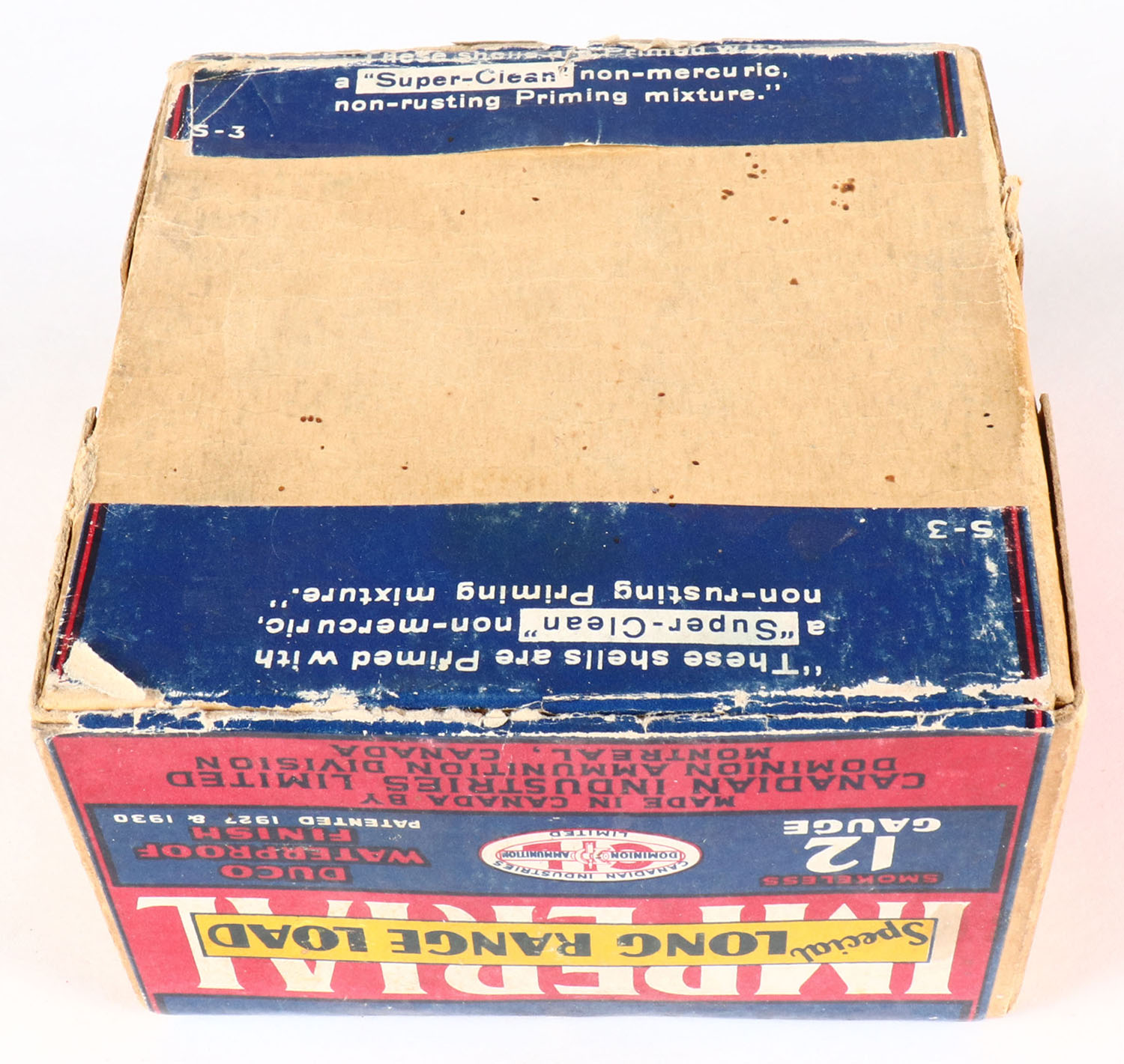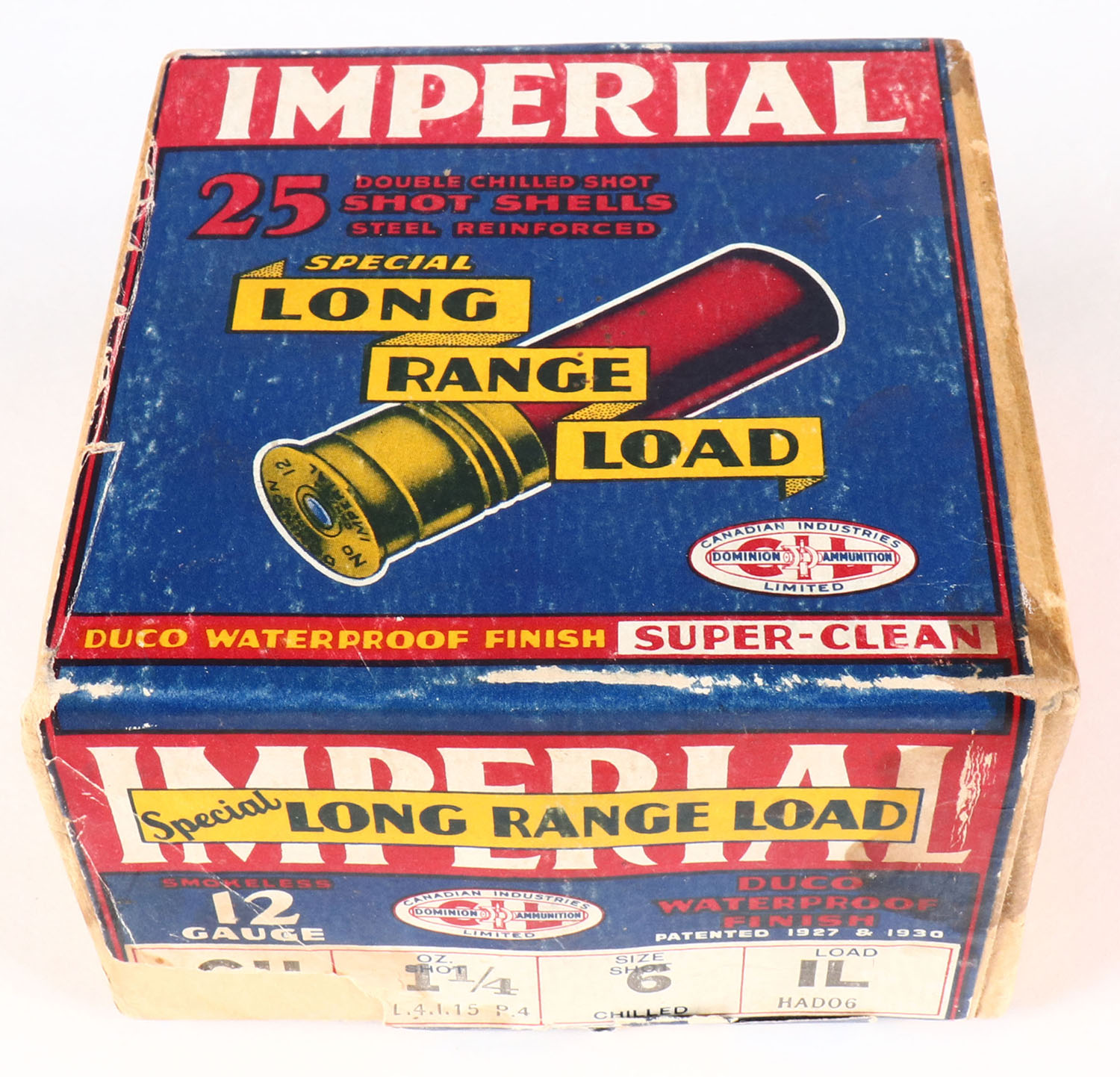 Dominion Cartridge Co, IMPERIAL, 12ga., 2pc., Empty, shot size 6CH, has early Bent D Logo, OVER LABEL ''SPECIAL LONG RANGE LOAD'', box is solid with some edge wear. Grade: Very Good ++ - Value: 50 to 200