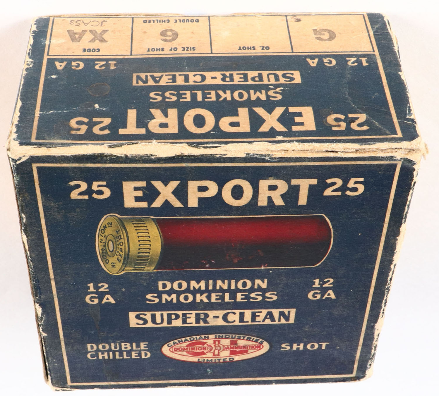 RARE Dominion Cartridge Co., EXPORT, 12ga., 1pc., Empty, shot size 6CH, multi-colored box, box has scuffing with edge wear. Grade: Very Good + - Value: 40 to 200