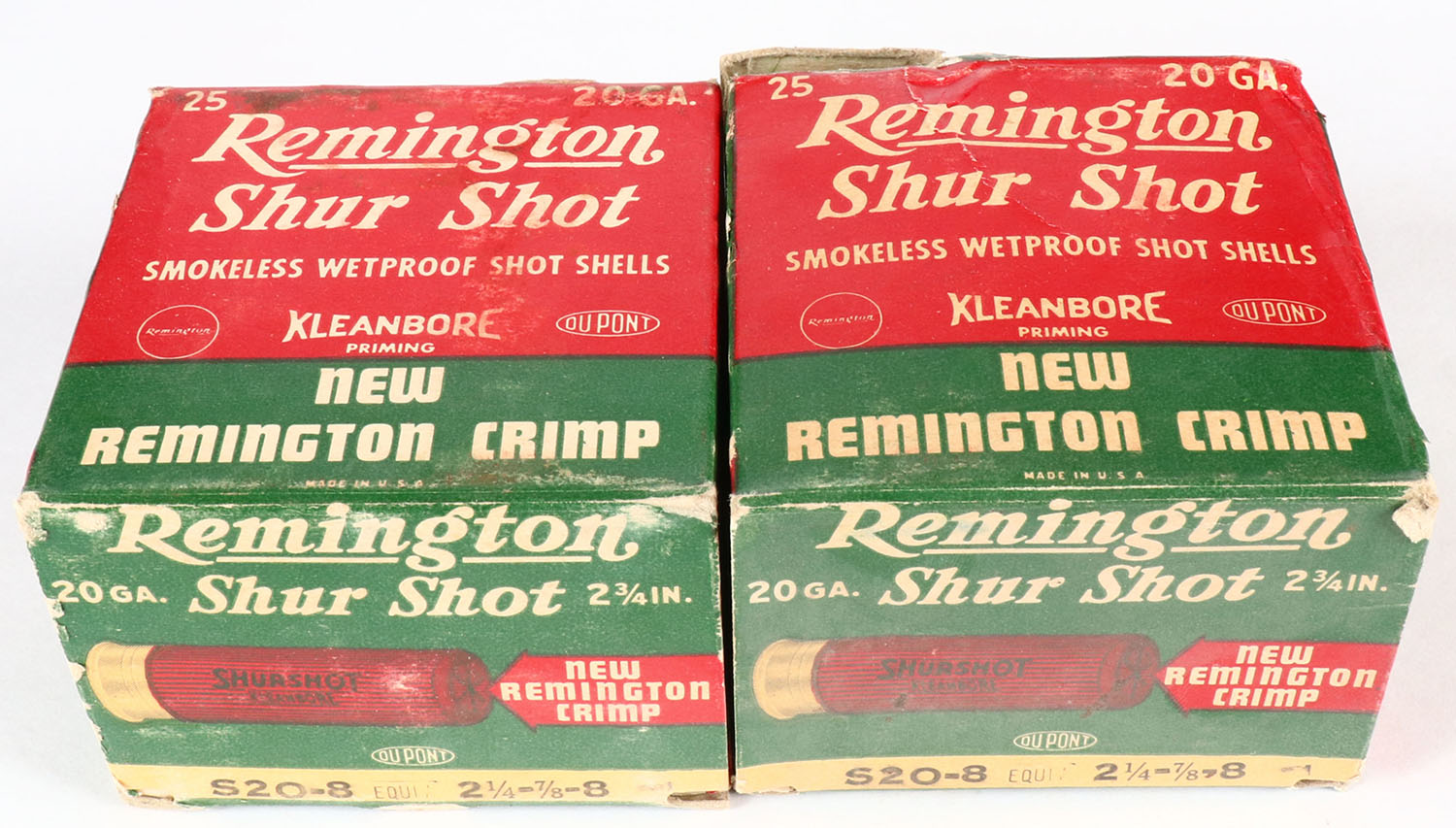 Lot of 2 Remington, Shur Shot, 20ga., 1pc., shot size 8, Appears Full, multi-colored boxes. Grade: Very Good - Value: 10 to 40