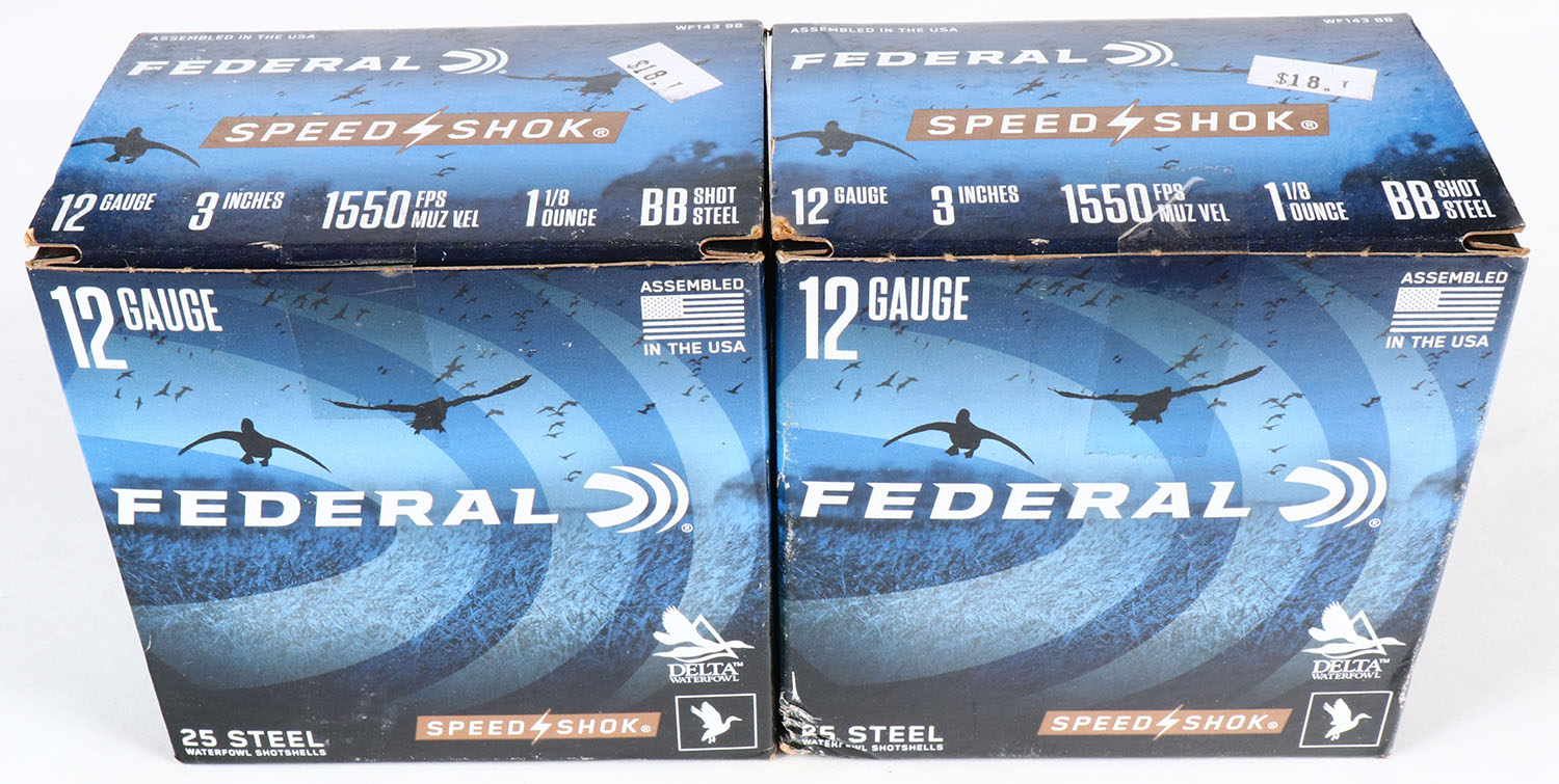 Lot of 2 Federal, 12ga., 1pc., Appears full, shot size BB Steel, multi-colored box. Grade: Excellent - Value: 10 to 40