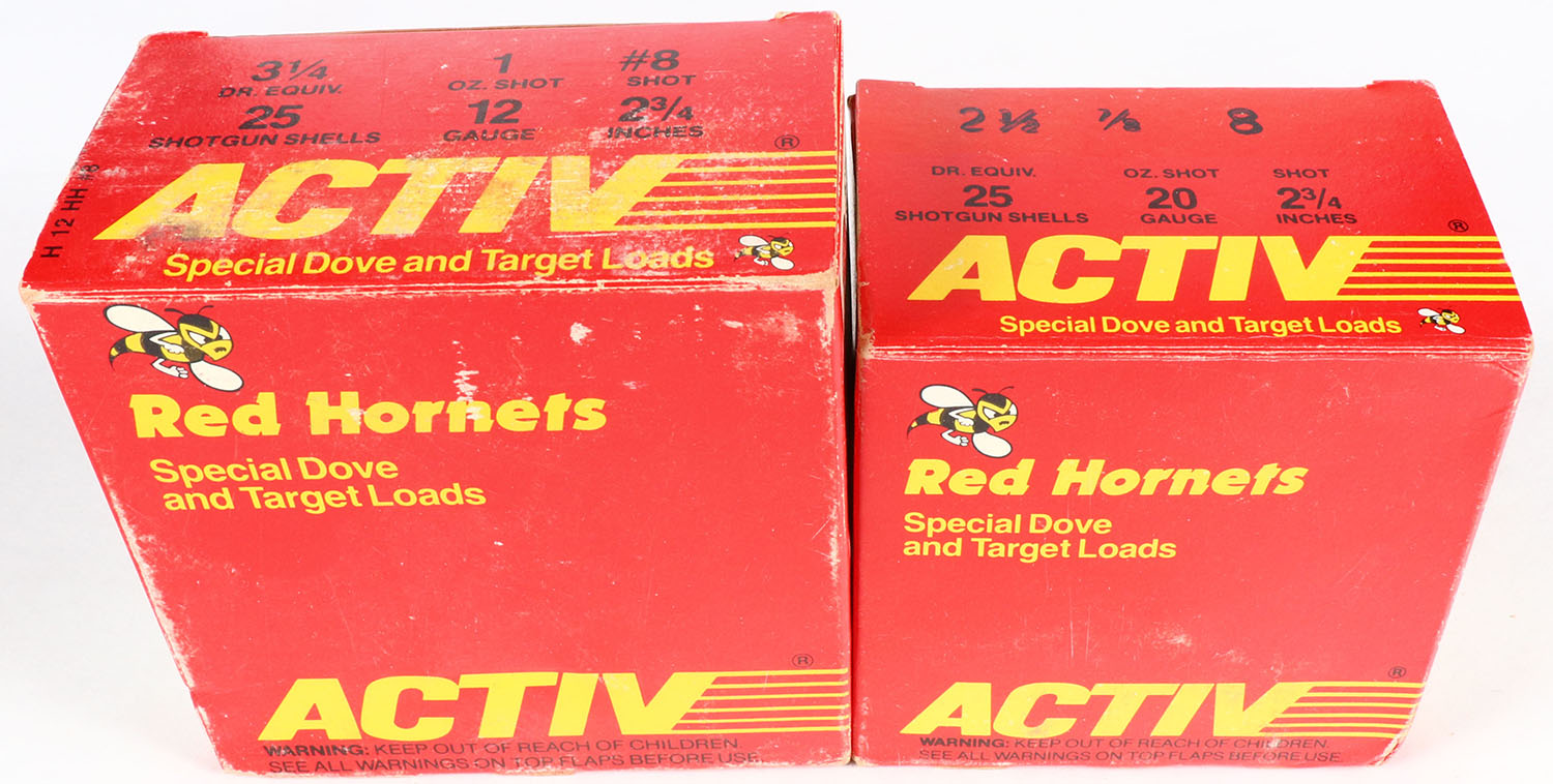 Lot of 2 Activ, 12ga. & 20ga., 1pc., Appears Full, shot size 8, multi-colored boxes. Grade: Very Good ++ - Value: 10 to 30