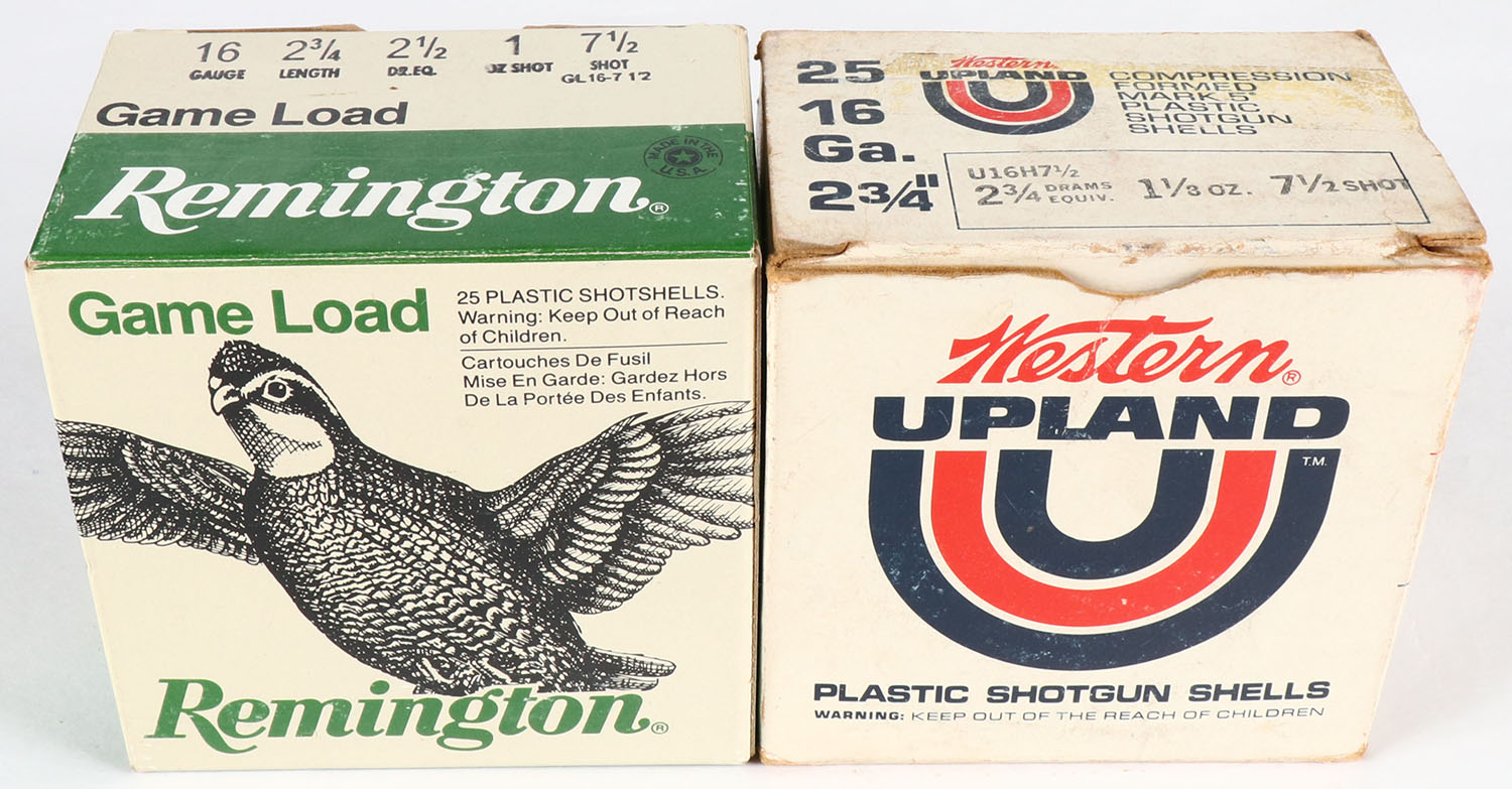 Lot of 2 Western & Remington, 16ga., 1pc., Appears Full, shot size 7 1/2, multi-colored boxes. Grade: Very Good - Value: 10 to 30
