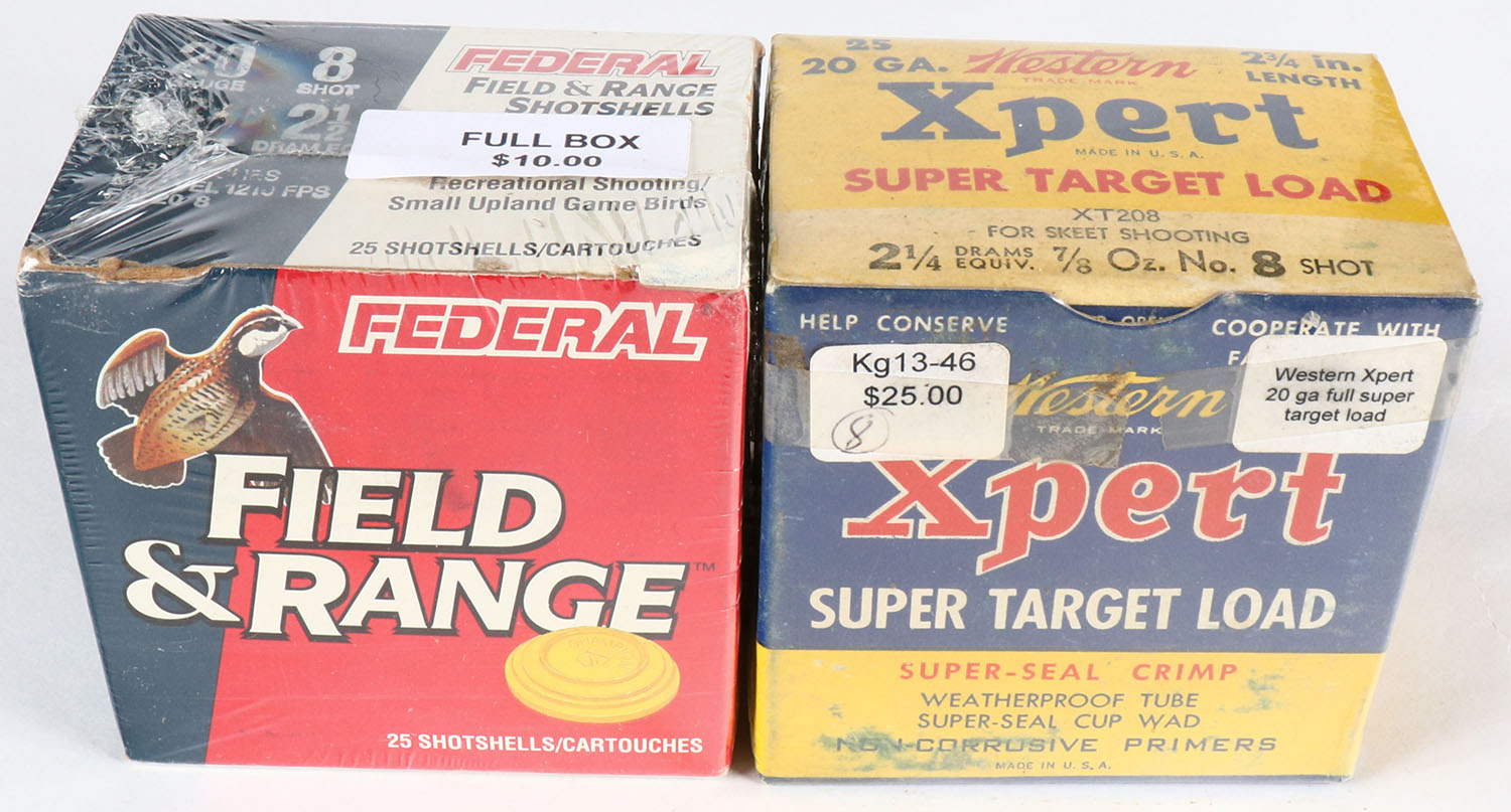 Lot of 2 Federal & Western, 20ga., 1pc., Appears Full, shot size 8, multi-colored boxes. Grade: Excellent - Value: 10 to 30