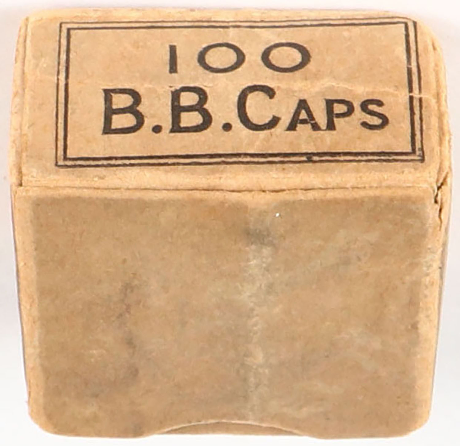 Winchester, .No. 1 Bullet Breech Caps, For Use in Saloon Rifles & Pistols, RR: WRA-23 BB-2, Full, 1pc. Buff box with black printing, box is solid with excellent color, minor age soiling, some edge & corner wear, top flap is solid, ammo is very good to excellent. Grade: Excellent - Value: 500 to 1500