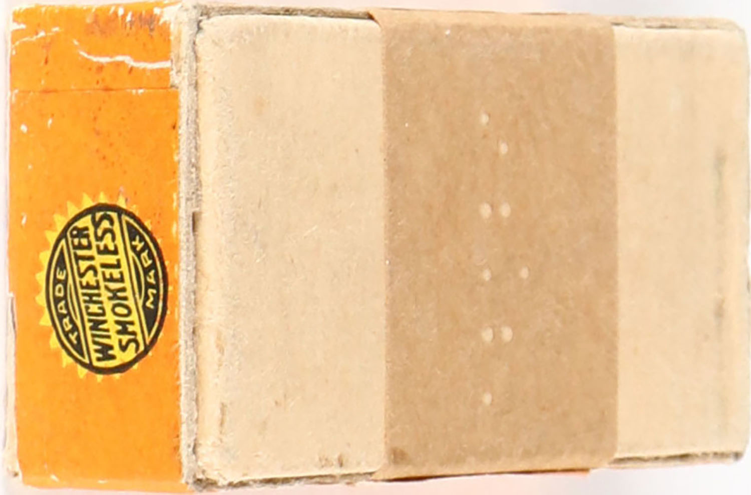 Winchester, Smokeless Rifle Cartridges, .22 Short, RR: WRA-57 S-25d, FULL & SEALED, 2pc. Buff box with green top & orange side sealing labels, box is solid with excellent color, small puncture on top, very minor corner wear, edges are mostly crisp, labels are intact. Grade: Excellent - Value: 100 to 300