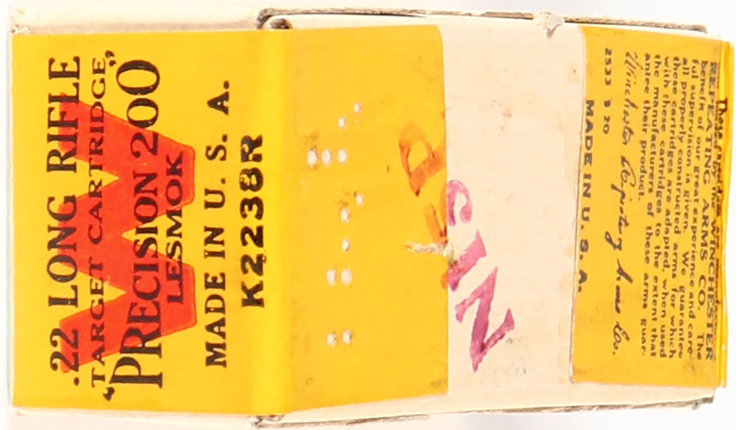 Winchester, ''Precision 200'', .22 Long Rifle, RR: WRA-129 LR-43c, FULL & SEALED, 2pc. Buff box with green red & white wraparound label, box is near mint with minty color, only very minor staining to top & bottom, corners are sharp, edges are crisp, label is intact. Grade: Excellent ++ - Value: 60 to 180
