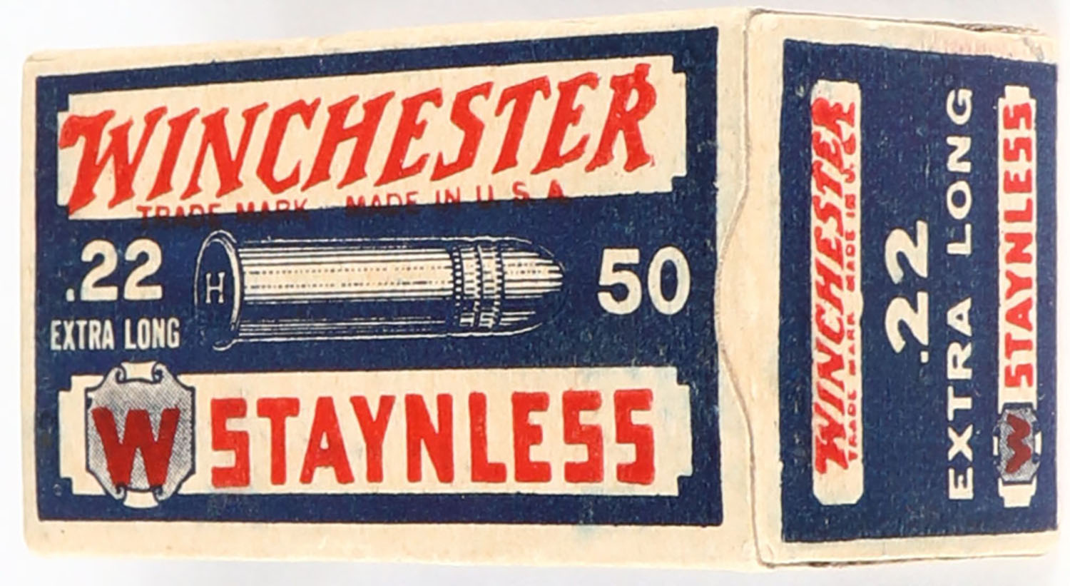 RARE! Winchester, Staynless, .22 Extra Long, RHWeb: WRA-12B XL-1c, Full, 1pc. Blue white & red box, box is very nearly mint with minty color, only very minor age soiling to bottom, corners are sharp, edges are crisp, end flaps are solid, ammo is very good to excellent. Grade: Excellent ++ - Value: 400 to 1200