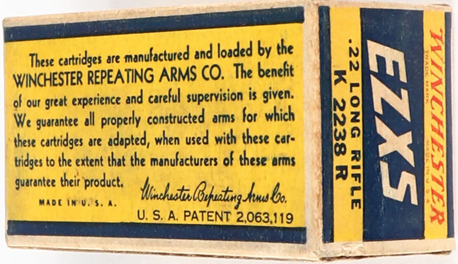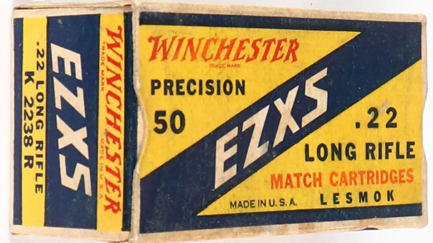 Winchester, EZXS, .22 Long Rifle, Match Cartridges, RHWeb: WRA-54 LR-3b (HS38), Partial 42rds. 1pc. Yellow blue & white box, box is solid with very good color, some age soiling & shelf wear, minor edge & corner wear, end flaps are solid, ammo is very good. Grade: Very Good - Value: 10 to 40