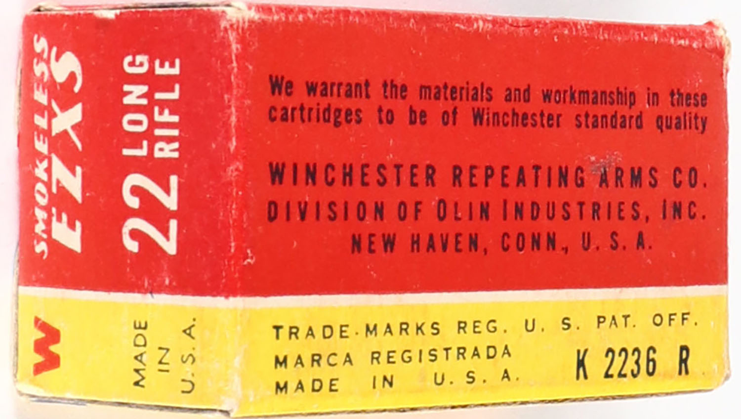 Winchester, Smokeless EZXS, .22 Long Rifle, Match Cartridges, RHWeb: WRA-54 LR-7a, Full, 1pc. Red yellow & blue box, box is solid with excellent color, minor corner wear, very minor edge wear, end flaps are solid, ammo is very good to excellent. Grade: Excellent - Value: 10 to 50