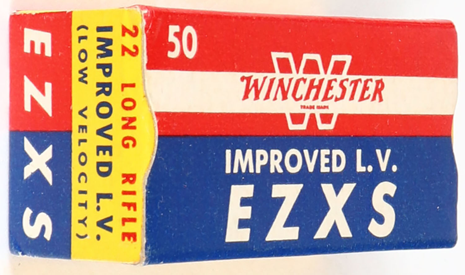 Winchester, Improved L.V. EZXS, .22 Long Rifle, Match Cartridges, RHWeb: WRA-54 LR-8b, Full, 1pc. Blue yellow & red box, box is near mint with minty color, only very minor corner wear, edges are crisp, end flaps are solid, ammo is excellent. Grade: Excellent + - Value: 30 to 90