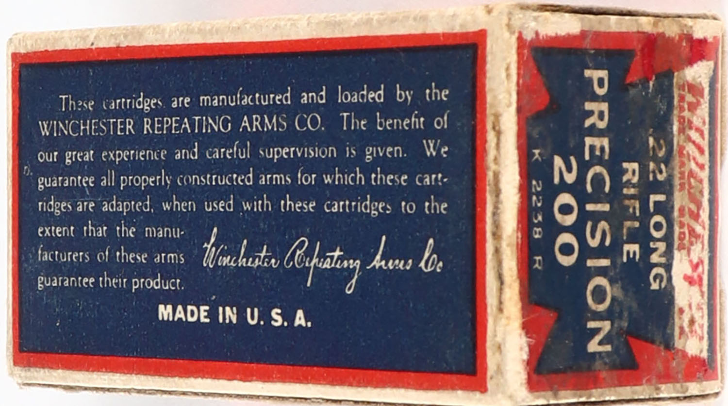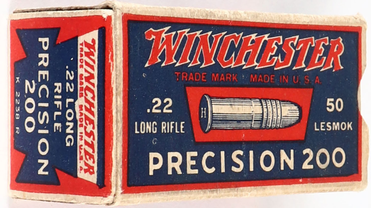 Winchester, Precision 200, .22 Long Rifle, Target Cartridges, RHWeb: WRA-53 LR-11e, Full, 1pc. Blue red & white box, box is solid with excellent color, minor age soiling & corner wear, very minor edge wear, soiling on right end, end flaps are solid, ammo is very good. Grade: Excellent - Value: 50 to 250