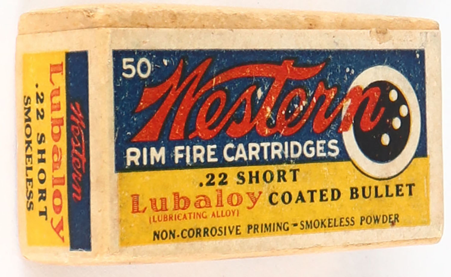 Western, Rim Fire Cartridges, .22 Short, Lubaloy Coated Bullet, RHWeb: WCC-4.2 S-1a, FULL & SEALED, 2pc. Buff box with yellow blue & red wraparound bull's eye label, box is solid with very good color, some age soiling & shelf wear, minor corner wear, edges are crisp, label is intact. Grade: Very Good ++ - Value: 50 to 200
