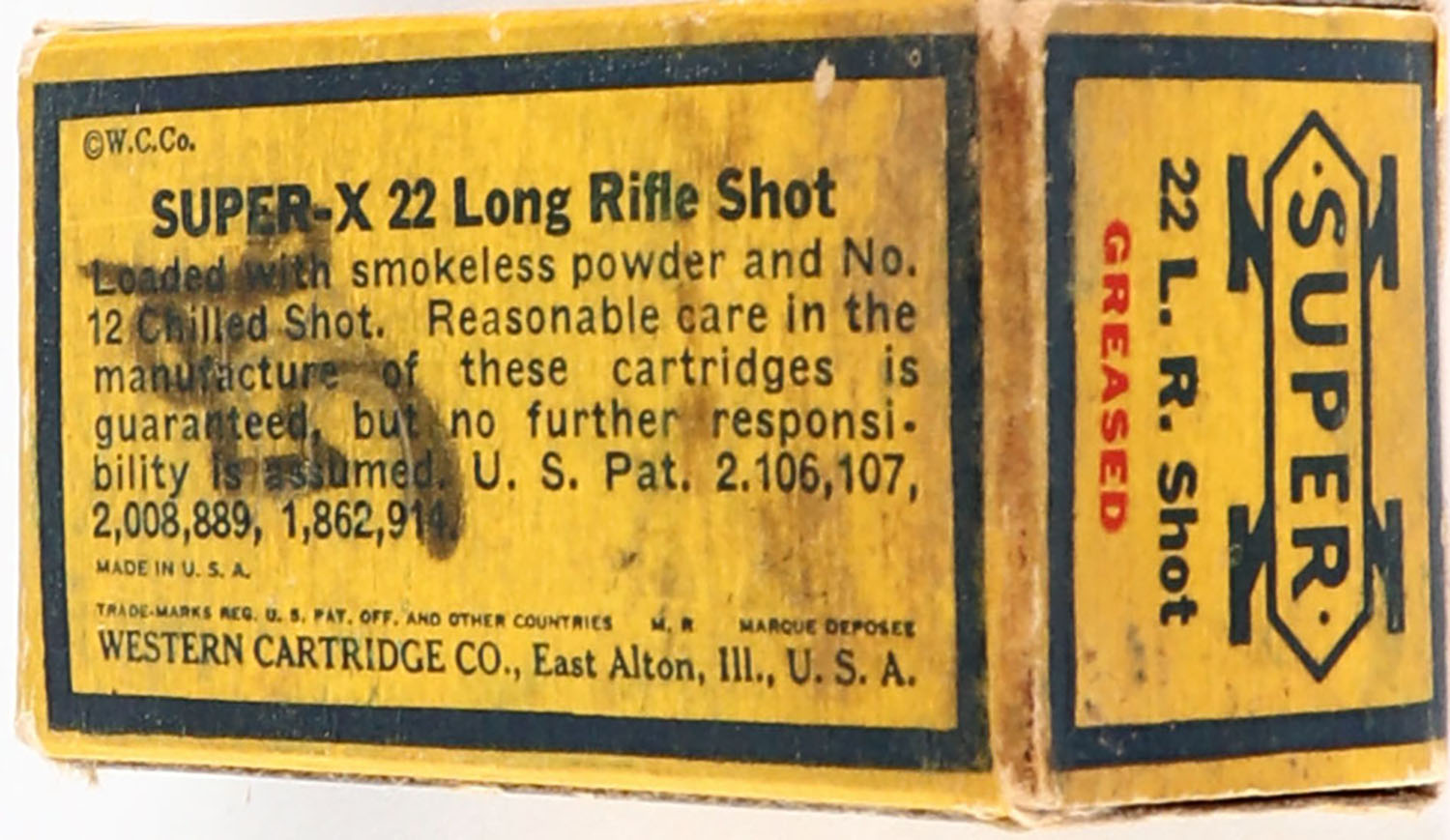 Western, Super-X, .22 Long Rifle Shot, Greased, RHWeb: Super-X-Long Rifle-43 LRS-8, Full, 1pc. Yellow blue & red box, box is solid with very good color, some age soiling, corner wear, very minor edge wear, end flaps are solid, ammo is excellent. Grade: Very Good + - Value: 20 to 80