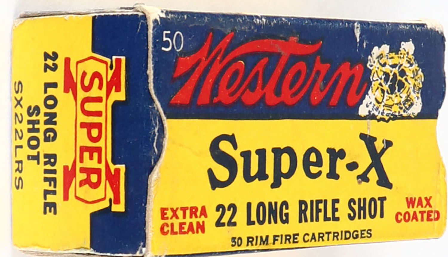 Western, Super-X, .22 Long Rifle Shot, Extra Clean Wax Coated, RHWeb: Super-X-Long Rifle-40 LRS-20, Full, 1pc. Yellow blue & red box, box is solid with excellent color, some edge & corner wear, end flaps are solid, ammo is excellent. Grade: Excellent - Value: 20 to 80