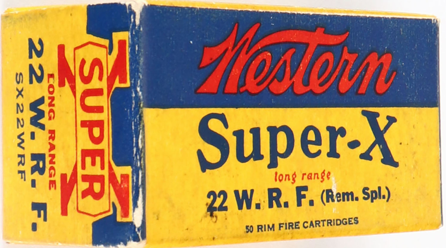 Western, Super-X, .22 W.R.F. (Rem. Spl.), Long Range, RHWeb: Super-X-WRF-14 WRF-21, Full, 1pc. Yellow blue & red box, box is solid with excellent color, minor age soiling & corner wear, edges are crisp, end flaps are solid, ammo is excellent. Grade: Excellent - Value: 12 to 48