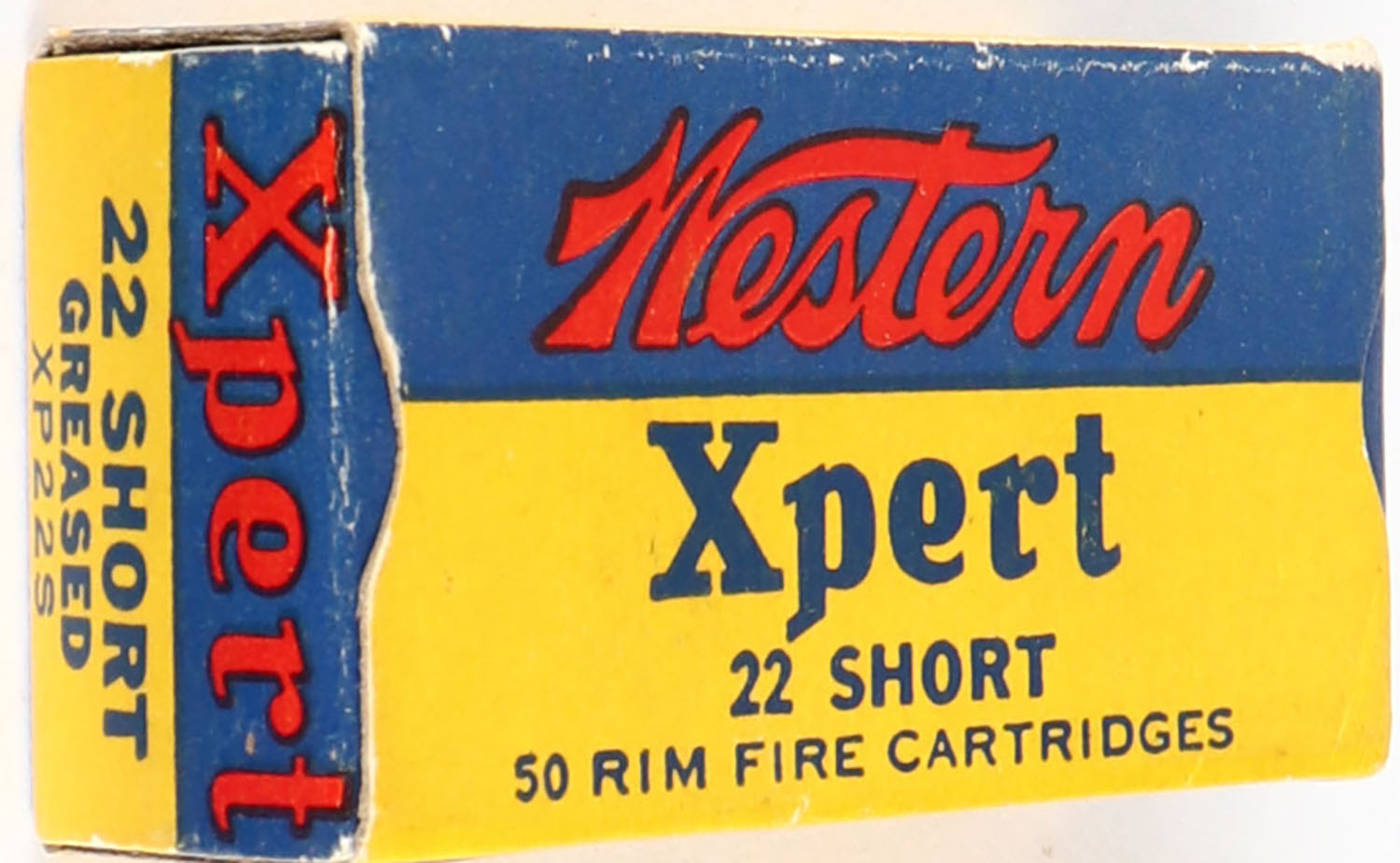 Western, Xpert, .22 Short, RHWeb: WCC-52 S-1g, Full, 1pc. Yellow blue & red box, box is solid with excellent color, very minor edge & corner wear, end flaps are solid, ammo is excellent. Grade: Excellent + - Value: 10 to 30