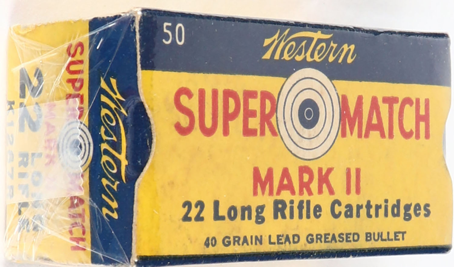 Western, Super Match Mark II, .22 Long Rifle, RHWeb: WCC-51.2 LR-3g, Full, 1pc. Yellow blue & red box, box is solid with excellent color, some color bleeding, corners are mostly sharp, edges are crisp, damage to one flap, ammo is excellent. Grade: Excellent - Value: 8 to 40