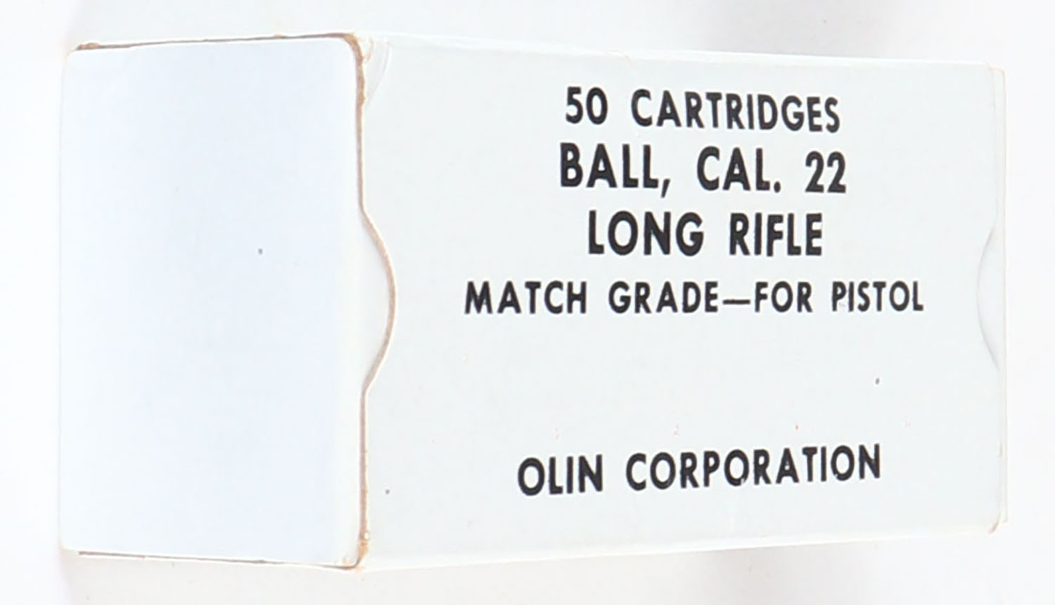 Olin, Match Grade - For Pistol, .22 Long Rifle, RHWeb: OLIN-1 LR-2.1b, Full, 1pc. White box with black printing, box is solid with minty color, very minor corner wear, edges are mostly crisp, end flaps are solid, ammo is minty. Grade: Excellent ++ - Value: 6 to 30
