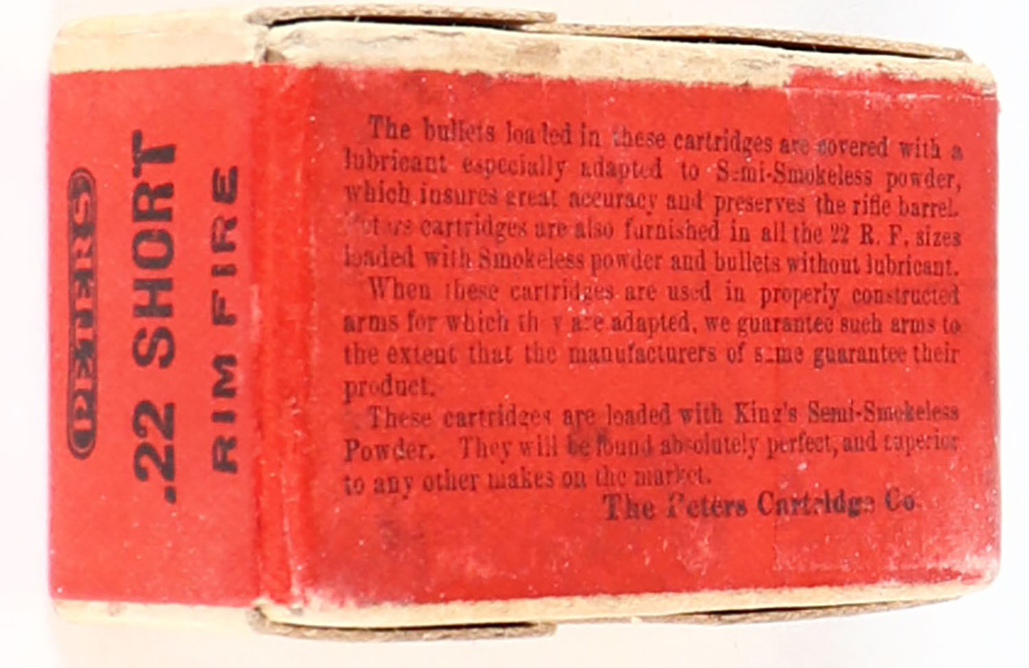 Peters, Rim Fire Rifle Cartridges, .22 Short, Swaged Bullet, RHWeb: PCC-4 S-1b, FULL & SEALED, 2pc. Buff box with red wraparound label, box is solid with excellent color, very minor color fading, corners are mostly sharp, edges are crisp, label is intact. Grade: Excellent + - Value: 20 to 80