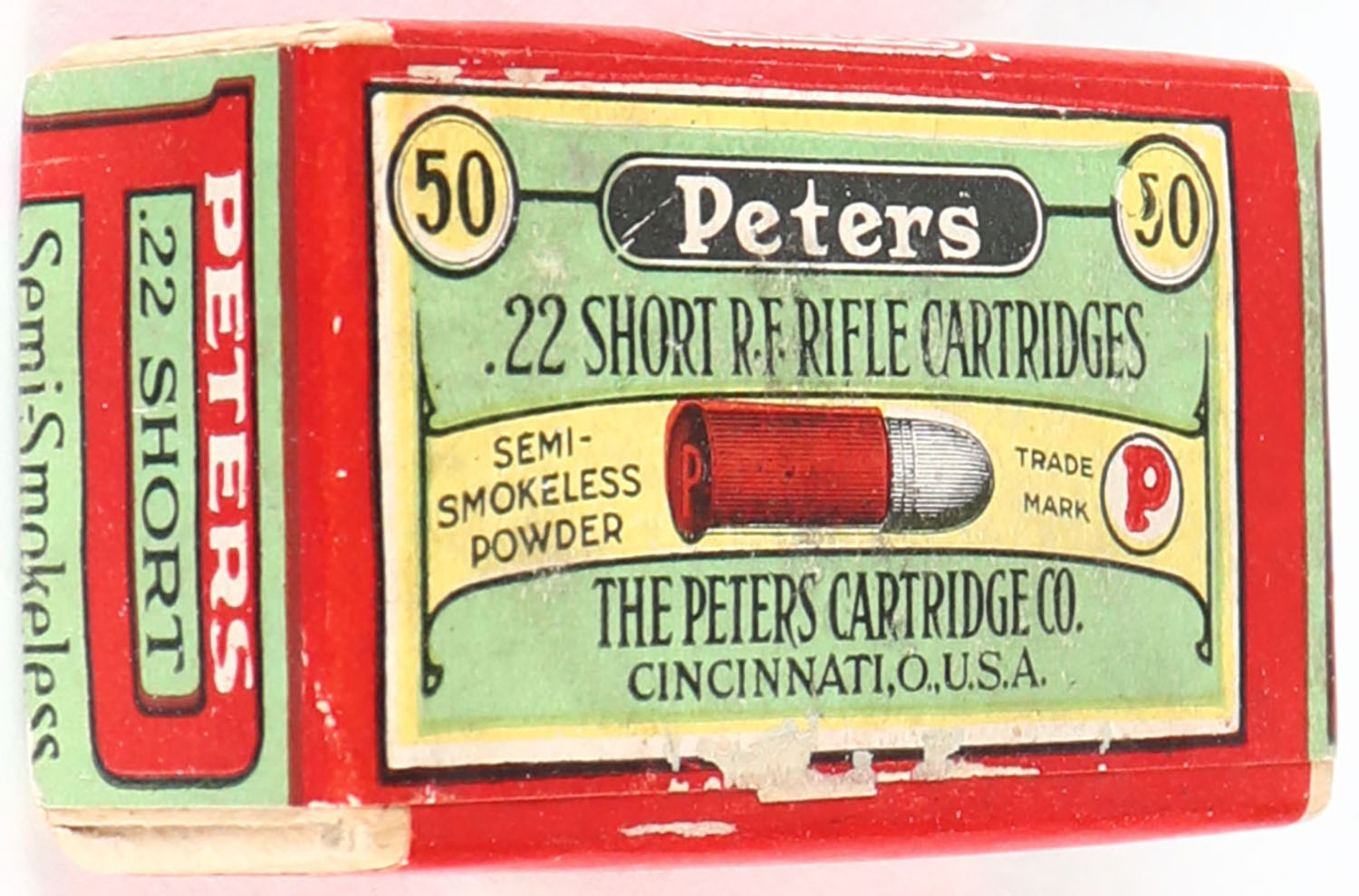 Peters, R.F. Rifle Cartridges, .22 Short, Semi-Smokeless Powder, RHWeb: PCC-5A S-1b, FULL & SEALED, 2pc. Buff box with red & green full cover label, box is solid with excellent color, very minor shelf & corner wear, edges are mostly crisp, box feels slightly swollen at the sides, label is intact. Grade: Excellent + - Value: 40 to 200