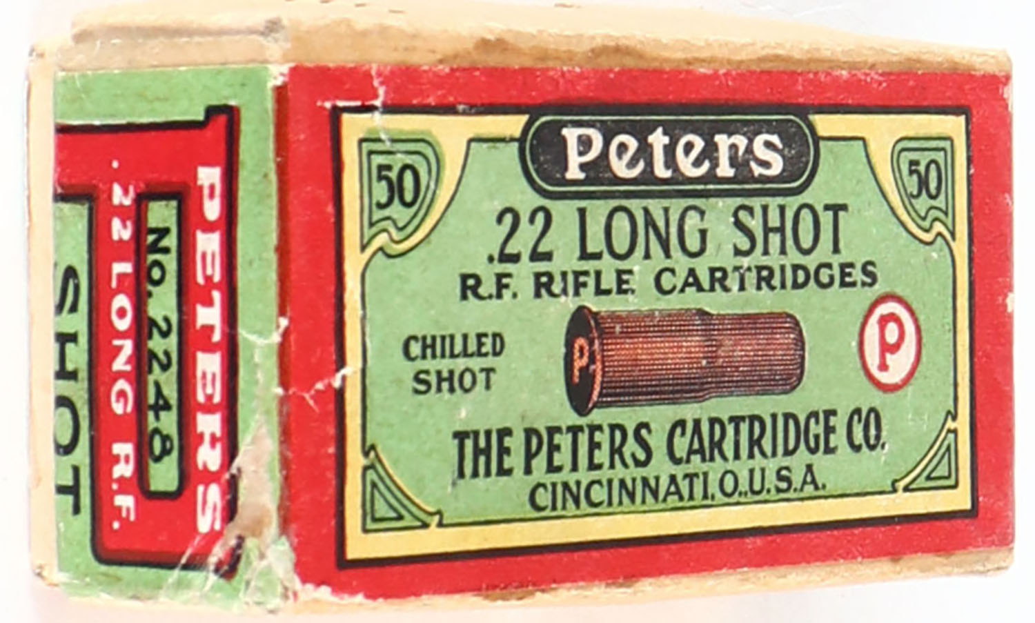Peters, R.F. Rifle Cartridges, .22 Long Shot, Chilled Shot, RHWeb: PCC-5A L-5c (A-1 bottom), Partial 44rds. 2pc. Buff box with green red & yellow wraparound label, box is solid with excellent color, very minor shelf wear, minor edge & corner wear, front of lid has been written on, label is intact, ammo is excellent. Grade: Excellent - Value: 30 to 90