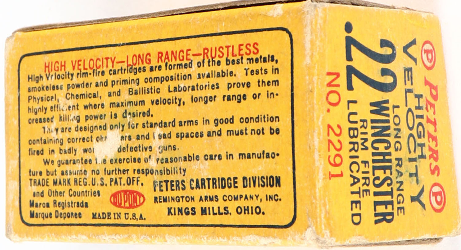 Peters, High Velocity Long Range, .22 Winchester Rim Fire, Kings Mills, RHWeb: PCC-11B WRF-1, Partial 38rds. correct, 1pc. Blue yellow & red box, box is solid with very good color, some age soiling, minor shelf wear, some edge & corner wear, end flaps are solid, ammo is excellent. Grade: Very Good + - Value: 30 to 90
