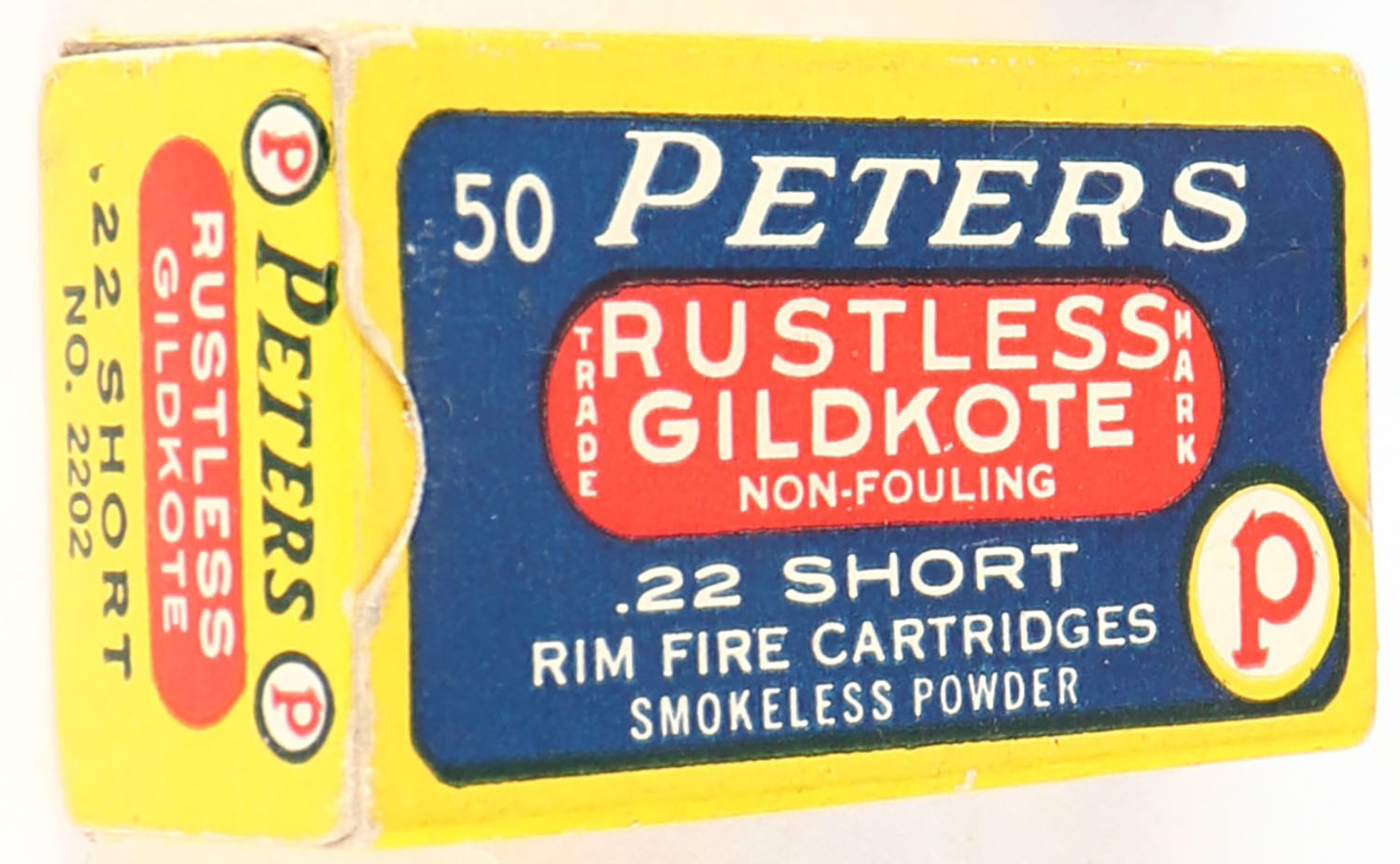Peters, Rustless Gildkote, .22 Short, Cincinnati, RHWeb: PCC-10 S-1, Full, 1pc. Blue yellow & red box, box is solid with excellent color, minor corner wear, very minor edge wear, end flaps are solid, ammo is minty. Grade: Excellent + - Value: 20 to 80