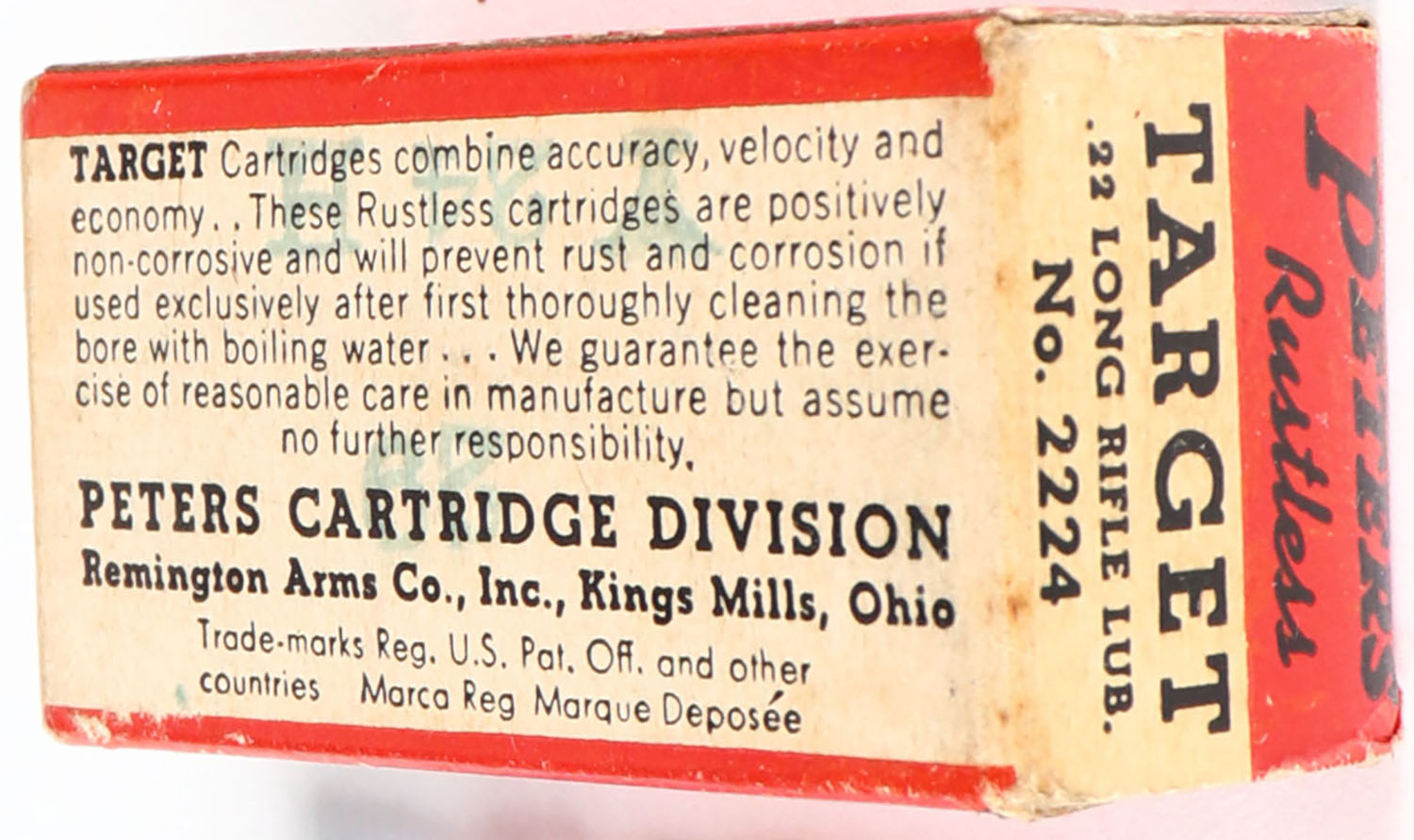 Peters, Target, .22 Long Rifle, RHWeb: PCC-54A LR-1a, Full, 1pc. Red black & white box, box is solid with excellent color, minor age soiling, very minor corner wear, edges are crisp, end flaps are solid, ammo is excellent. Grade: Excellent + - Value: 10 to 50