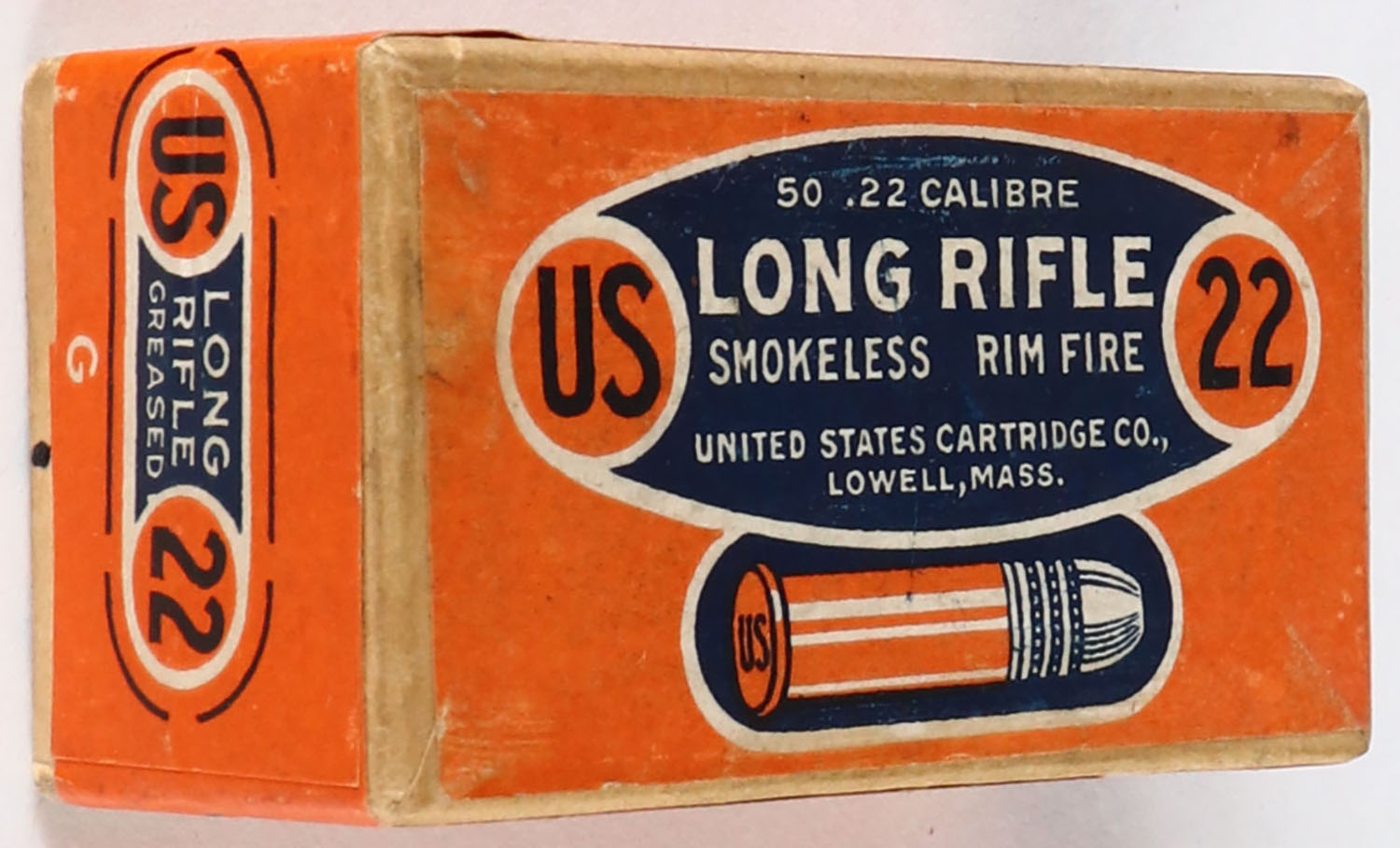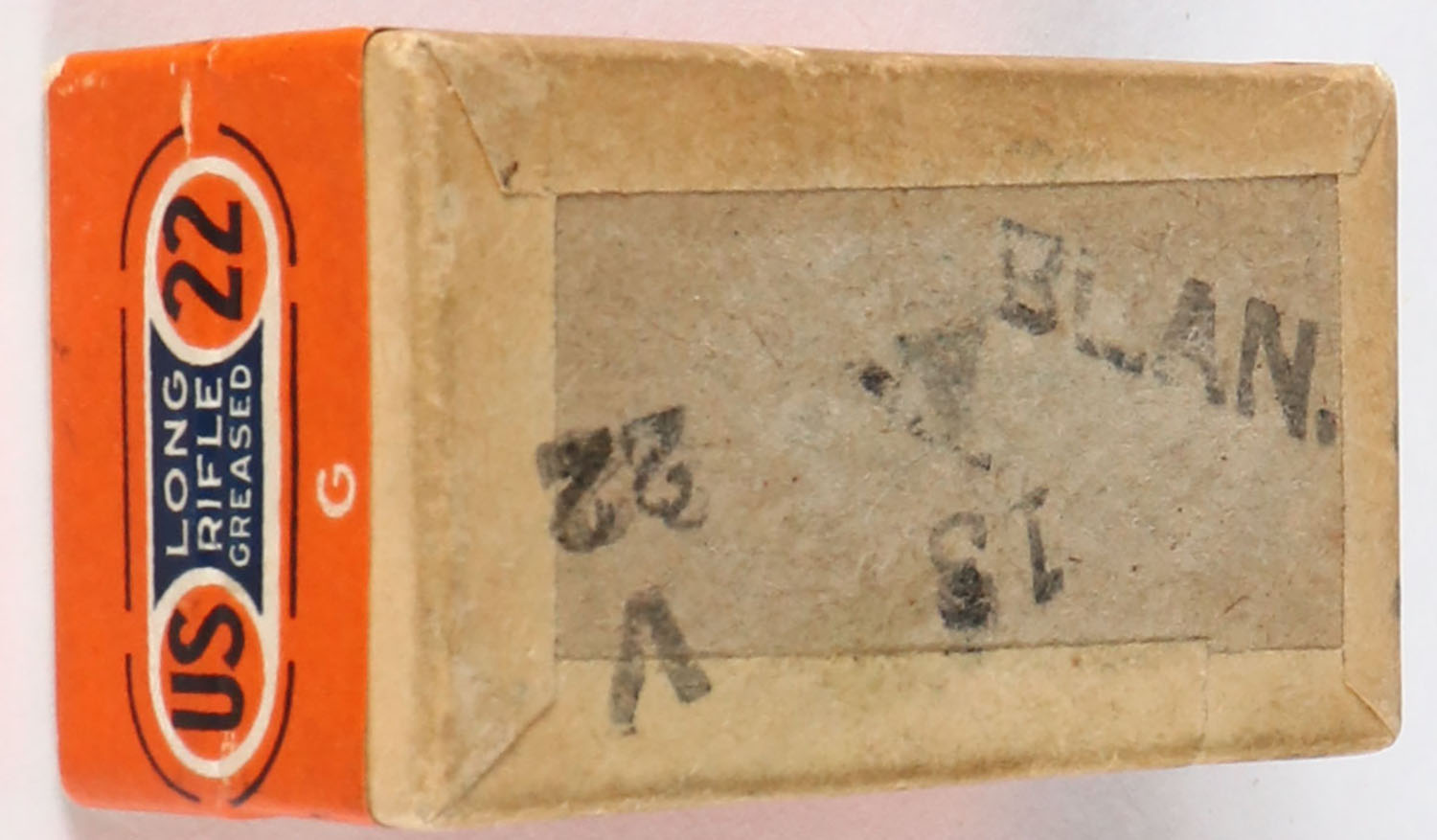 U.S., Smokeless Rim Fire, .22 Long Rifle, Greased, RHWeb: US-7 LR-2, FULL & SEALED, 2pc. Buff box with orange/blue top & side sealing labels, box is solid with excellent color, very minor age soiling, corners are mostly sharp, edges are mostly crisp, labels are intact. Grade: Excellent - Value: 30 to 90