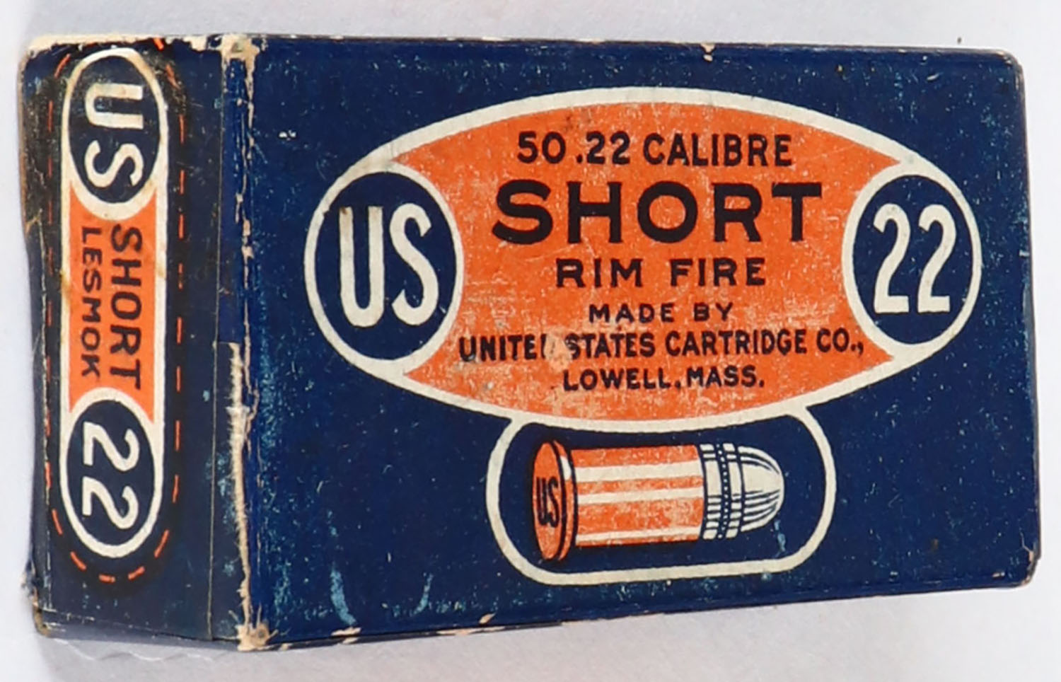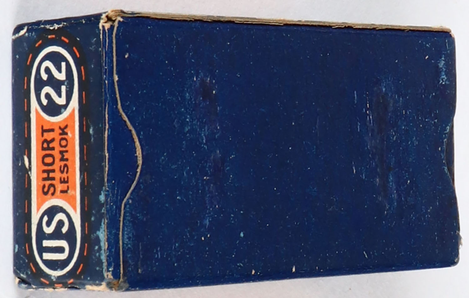 U.S., Lesmok Rim Fire, .22 Long Rifle, RHWeb: US-8 S-2b, FULL & SEALED, 1pc. Blue orange & white box with blue & orange side sealing label, box is solid with excellent color, minor shelf & corner wear, edges are crisp, side sealing label is intact. Grade: Excellent + - Value: 10 to 50