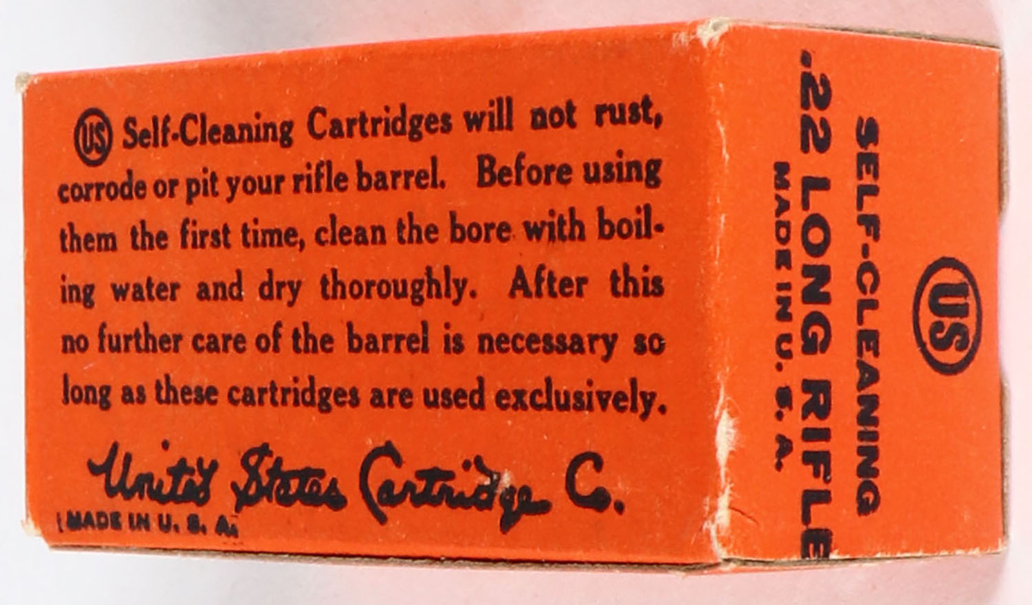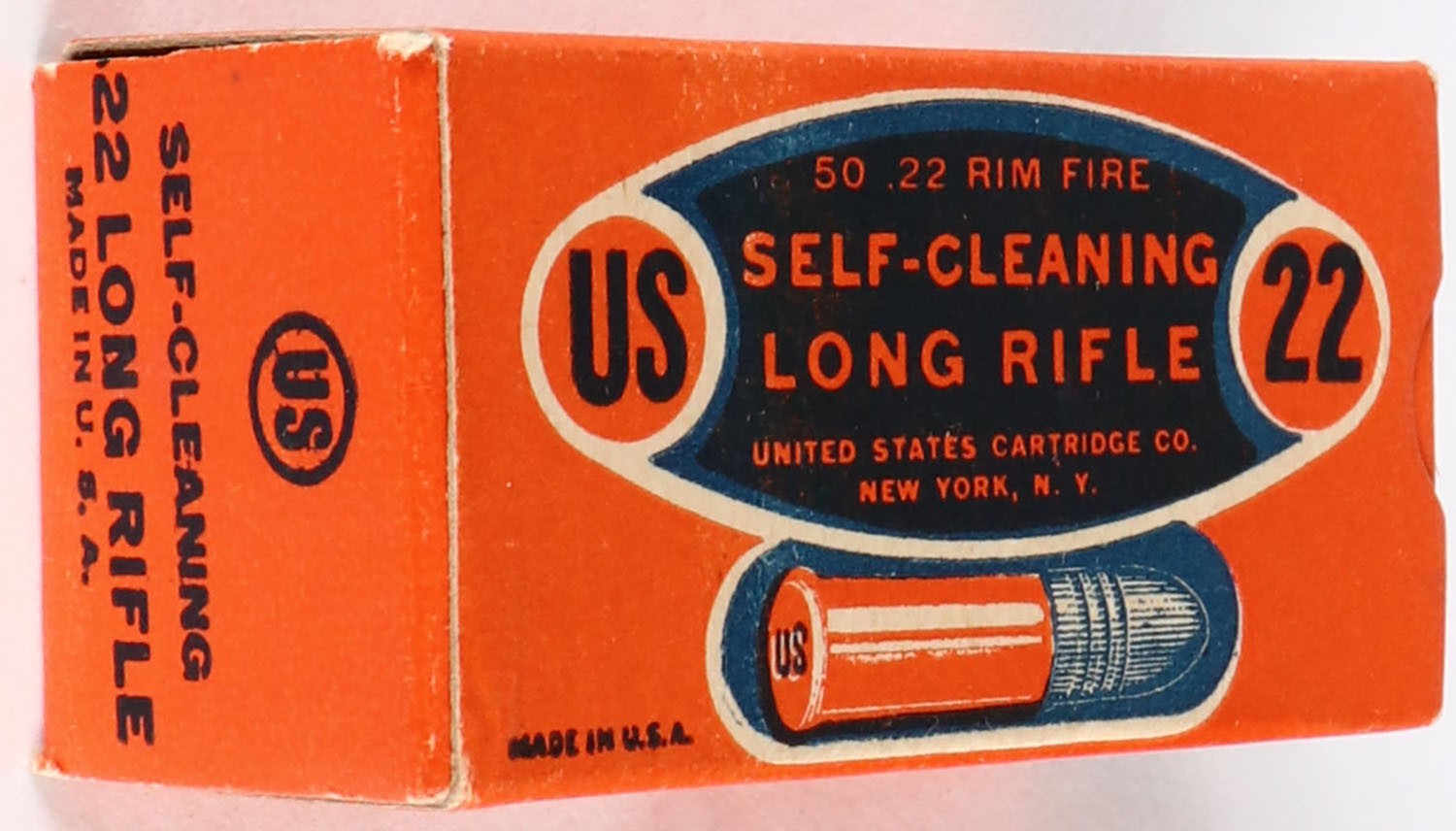 U.S., Self-Cleaning, .22 Long Rifle, RHWeb: US-10A S-1b, Full, 1pc. Orange blue & white box, box is near mint with excellent to minty color, only very minor age soiling & corner wear, edges are crisp, end flaps are solid, ammo is very good. Grade: Excellent ++ - Value: 10 to 50