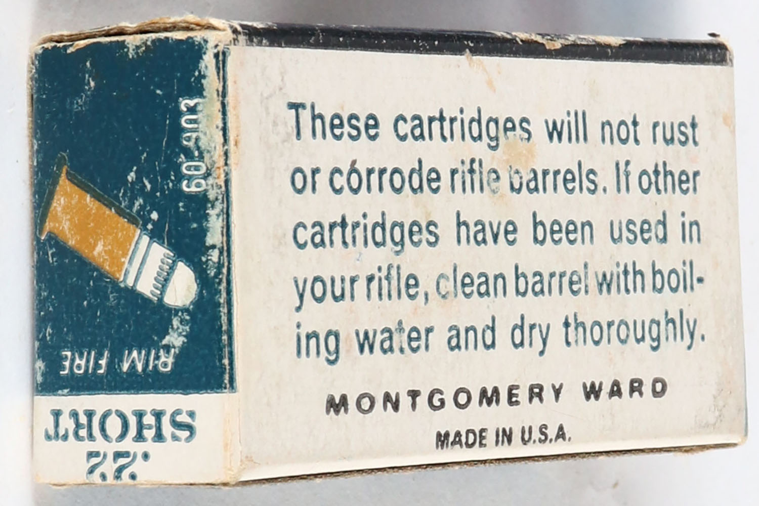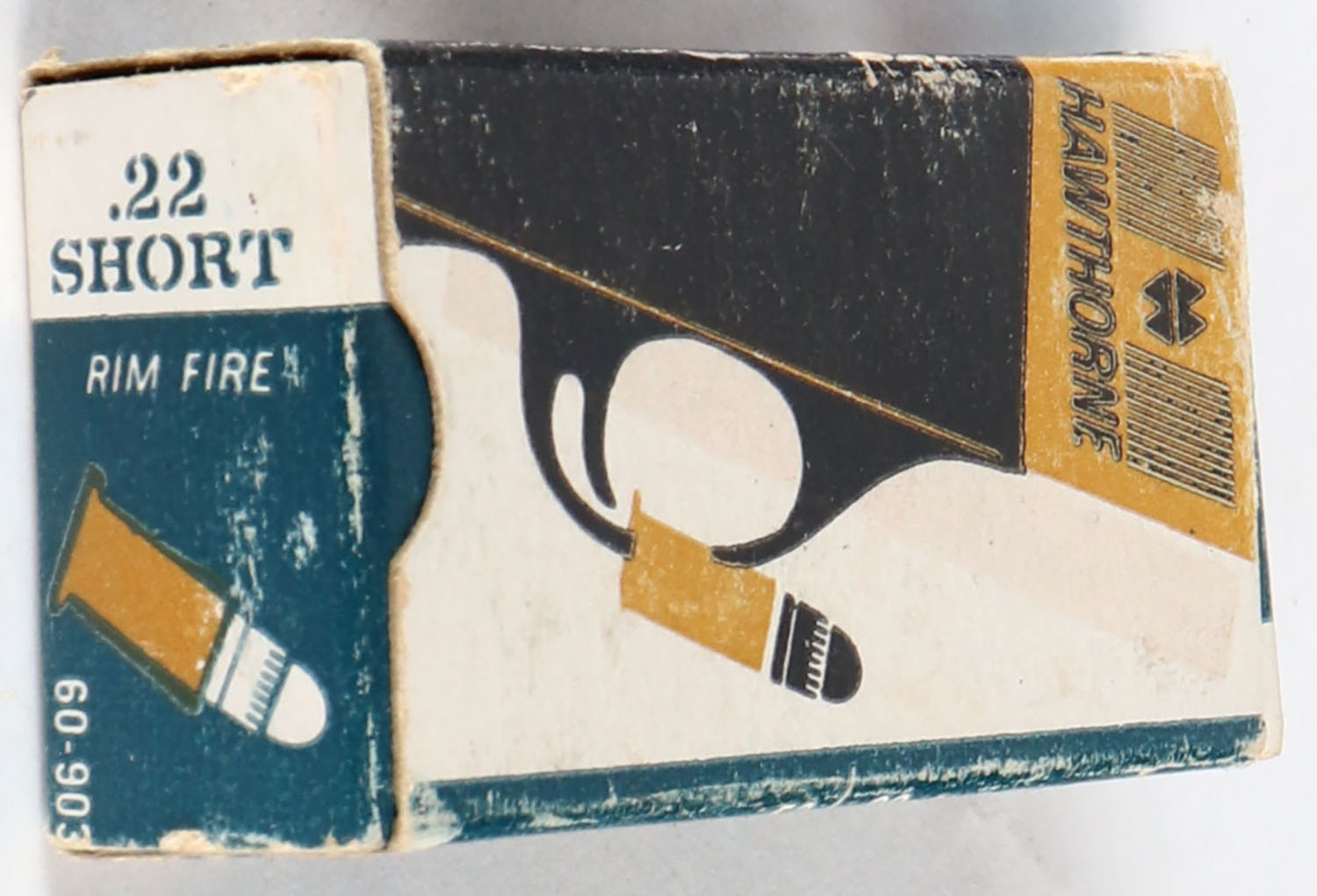 Wards, Hawthorne Cleanfire, .22 Short, RHWeb: MW-5 S-1b, Partial 41rds., 1pc. White blue & black box, box is solid with very good color some age soiling & shelf wear, minor edge & corner wear, end flaps are solid, ammo is excellent to minty. Grade: Very Good + - Value: 10 to 40