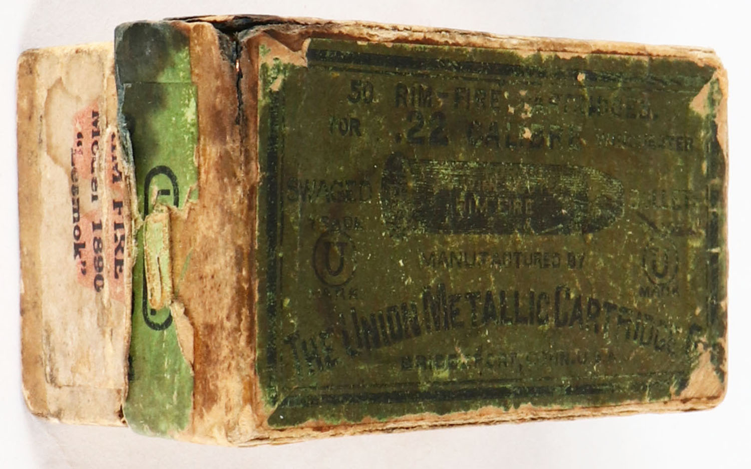 UMC, Rim-Fire Cartridges, .22 Winchester Rim Fire, Swaged Bullets, RHWeb: UMC-8.5 WRF-1, Full (unclear if this is correct ammo, copper case, no H/S), 2pc. Buff box with green top & side sealing labels, box bottom does not match (Winchester box with white side sealing label), box is solid with poor to fair color, age soiling, some shelf wear, edge & corner wear, side sealing label is 40% intact, ammo is excellent. Grade: Good - Value: 10 to 40