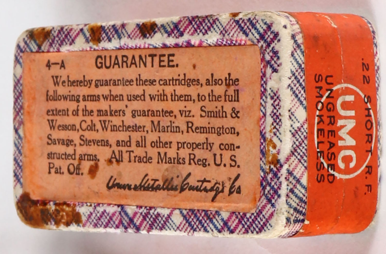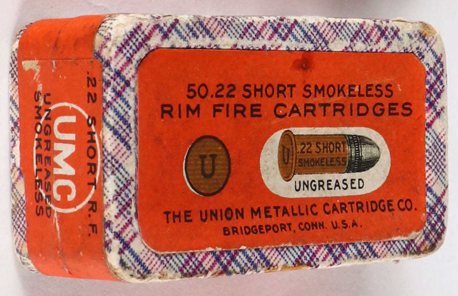 UMC, Rim Fire Cartridges, .22 Short, Smokeless Ungreased, RHWeb: UMC-9.5 S-6, FULL & SEALED, 2pc. Purple fabric box with orange top & side sealing labels, box is solid with excellent color, very minor age soiling, some staining, minor edge & corner wear, labels are intact. Grade: Excellent + - Value: 200 to 400