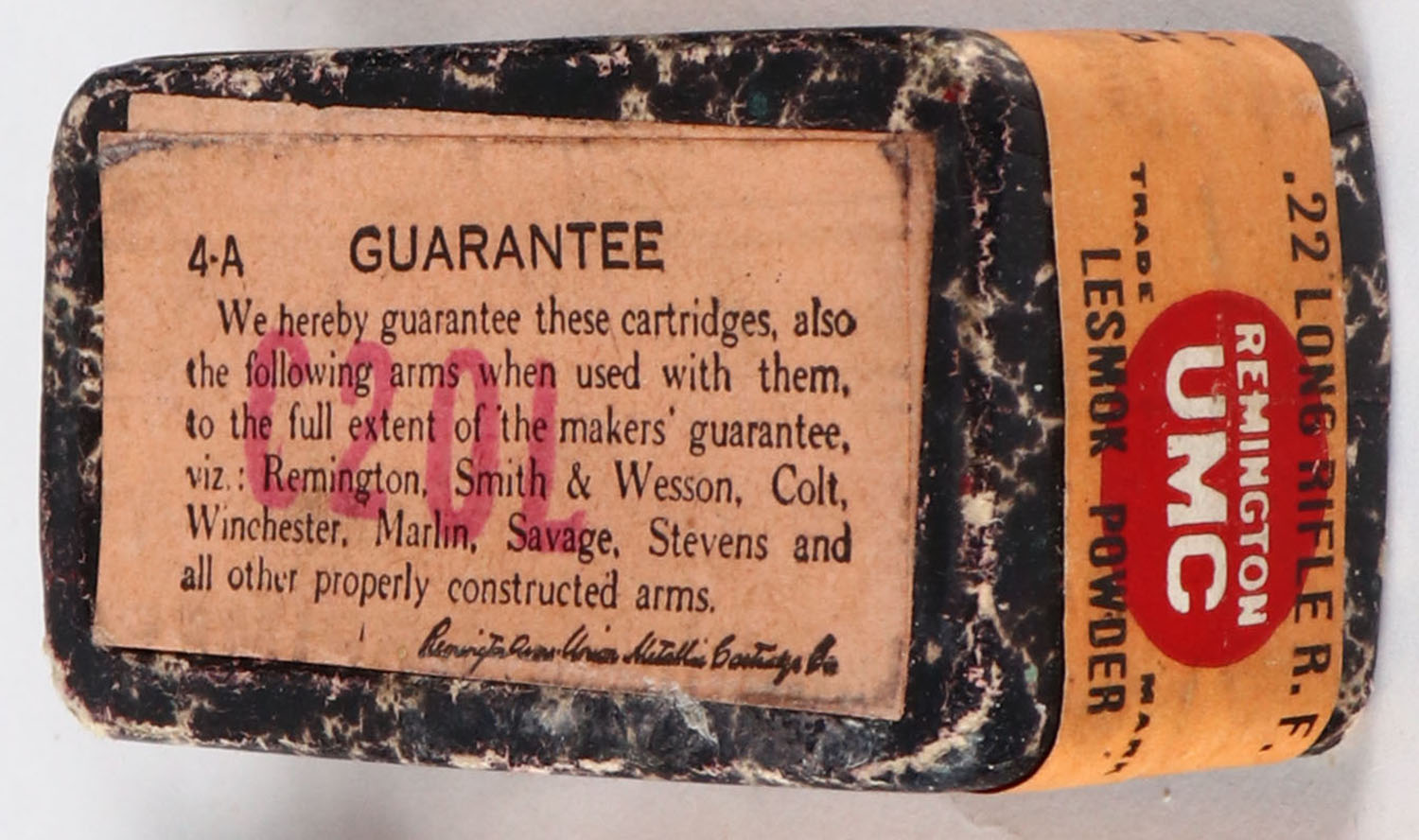 REM-UMC, R.F. Lesmok Cartridges, .22 Long Rifle, RHWeb: REM-1 LR-2A, FULL & SEALED, 2pc. Black mottled box with orange top & side sealing labels, box is solid with excellent color, very minor age soiling, some edge & corner wear, labels are intact. Grade: Excellent - Value: 40 to 200