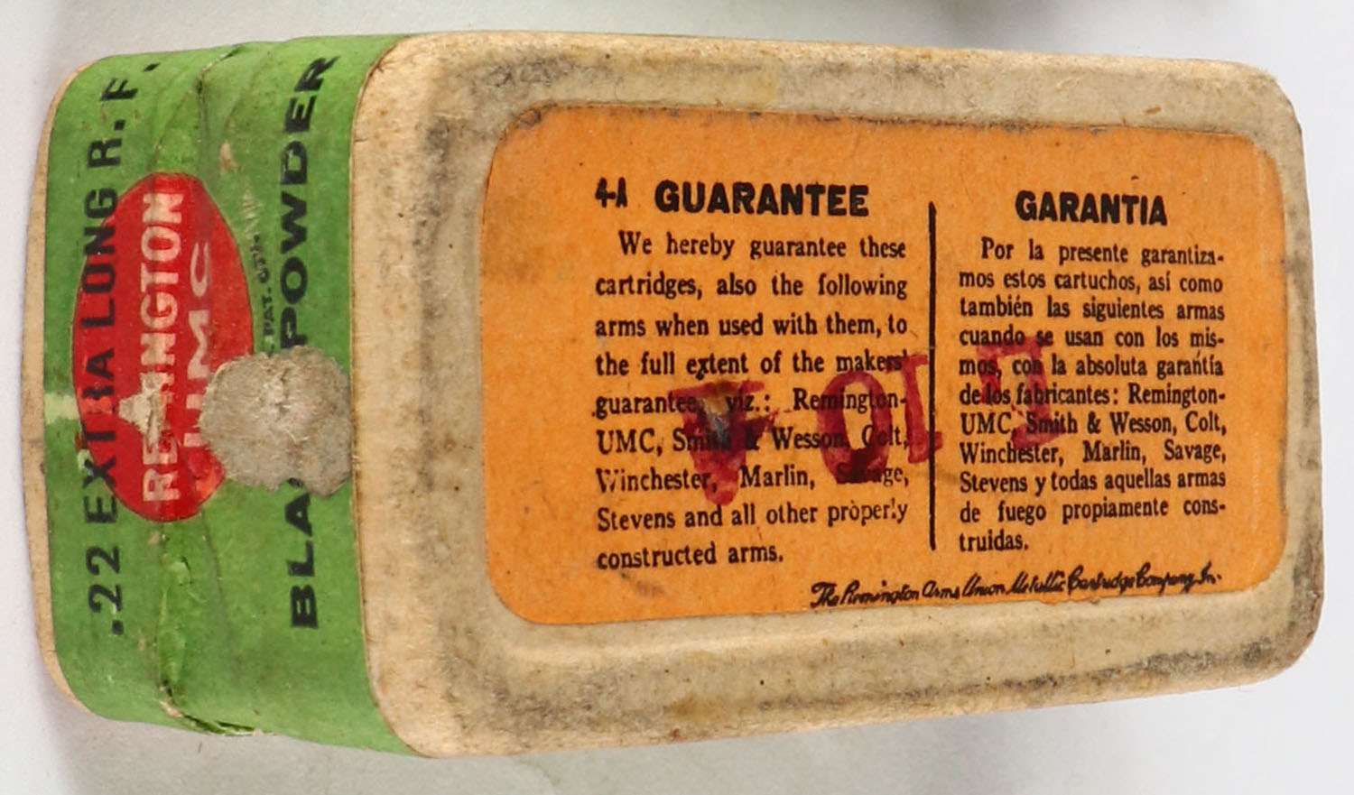 REM-UMC, Rim Fire Cartridges, .22 Extra Long, RHWeb: REM-2 XL-1B, FULL & SEALED, 2pc. Buff box with green top & side sealing labels, box is solid with very good color, some age soiling & shelf wear, very minor edge wear, labels are intact. Grade: Very Good ++ - Value: 200 to 600