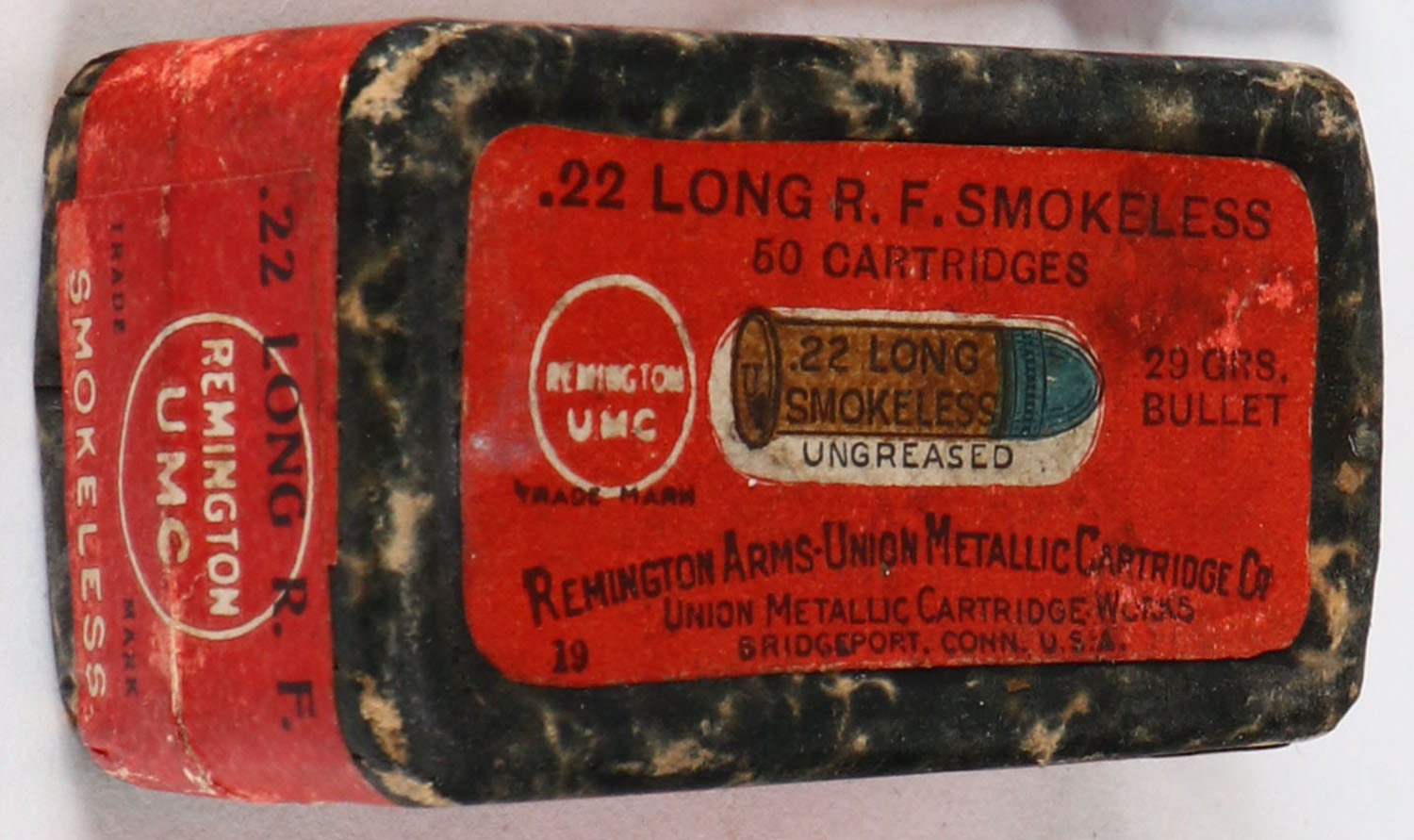 REM-UMC, R.F. Smokeless Cartridges, .22 Long, Ungreased, RHWeb: REM-2 L-5A, FULL & SEALED, 2pc. Black mottled box with red top & side sealing labels, box is solid with excellent color, very minor age soiling, small stain on top, minor edge & corner wear, labels are intact. Grade: Excellent - Value: 30 to 90