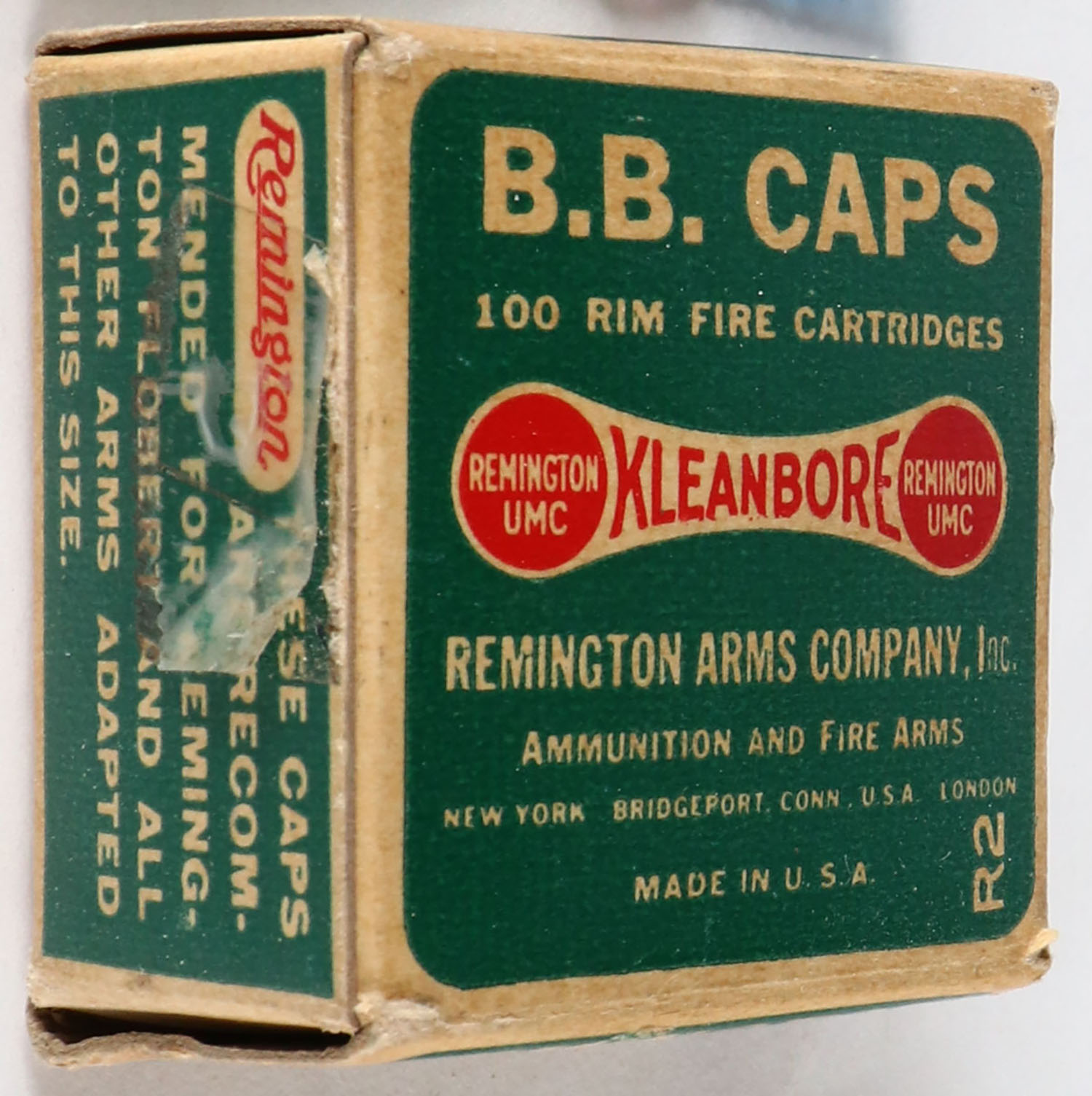 Remington, Kleanbore, B.B. Caps, RHWeb: REM-7.1B BB-1c, Full, 1pc. Green buff & red dog bone box, box is solid with excellent color, minor corner wear, edges are mostly crisp, flaps are solid, tape on left end, ammo is very good. Grade: Excellent + - Value: 30 to 90