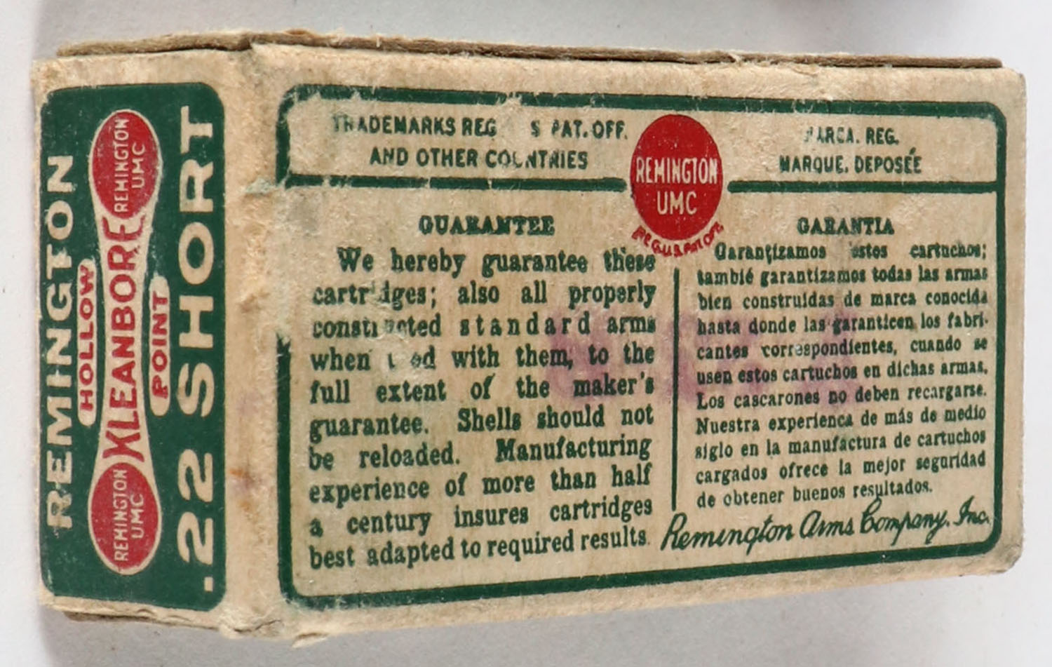 Remington, Kleanbore, .22 Short Hollow Point, RHWeb: REM-7.1B S-2, Full, 1pc. Green buff & red dog bone box, box is solid with very good to excellent color, minor age soiling, some shelf wear, very minor corner wear, edges are crisp, end flaps are solid, ammo is good. Grade: Very Good + - Value: 40 to 160