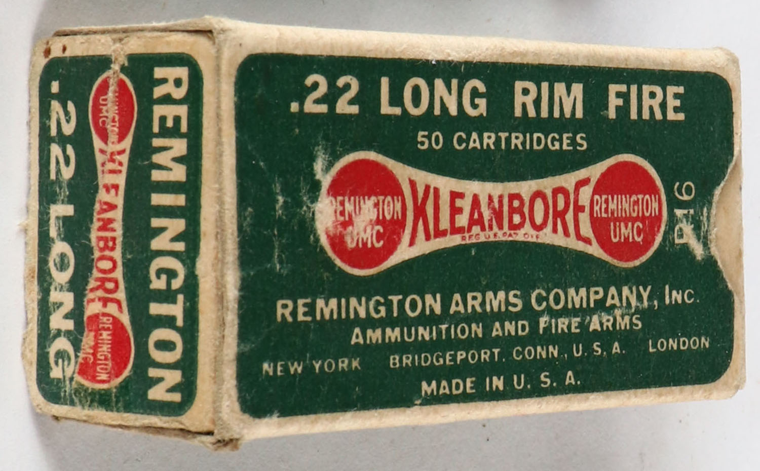 Remington, Kleanbore, .22 Long, RHWeb: REM-7.1B L-1d, Full, 1pc. Green buff & red dog bone box, left end flap is torn, very good to excellent color, stain on front, some shelf wear, minor corner wear, very minor edge wear, right end flap is solid, ammo is very good. Grade: Very Good - Value: 10 to 40
