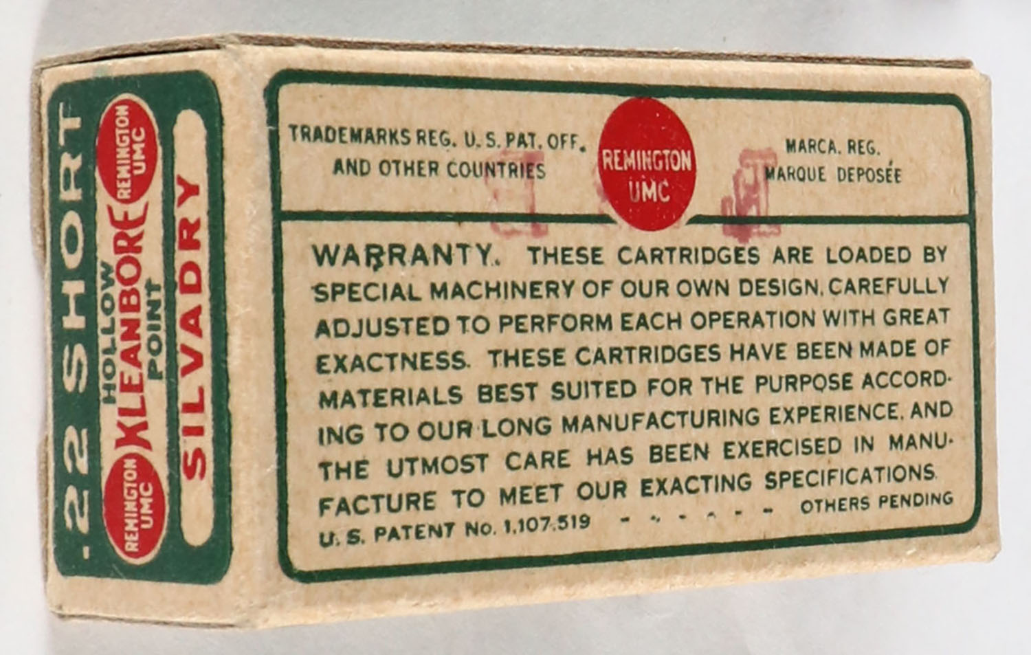 Remington, Silvadry Kleanbore, .22 Short, RHWeb: REM-7.3 S-1, Empty, 1pc. Green buff & red dog bone box, box is solid with excellent color, very minor corner wear, edges are crisp, end flaps are solid. Grade: Excellent ++ - Value: 6 to 30