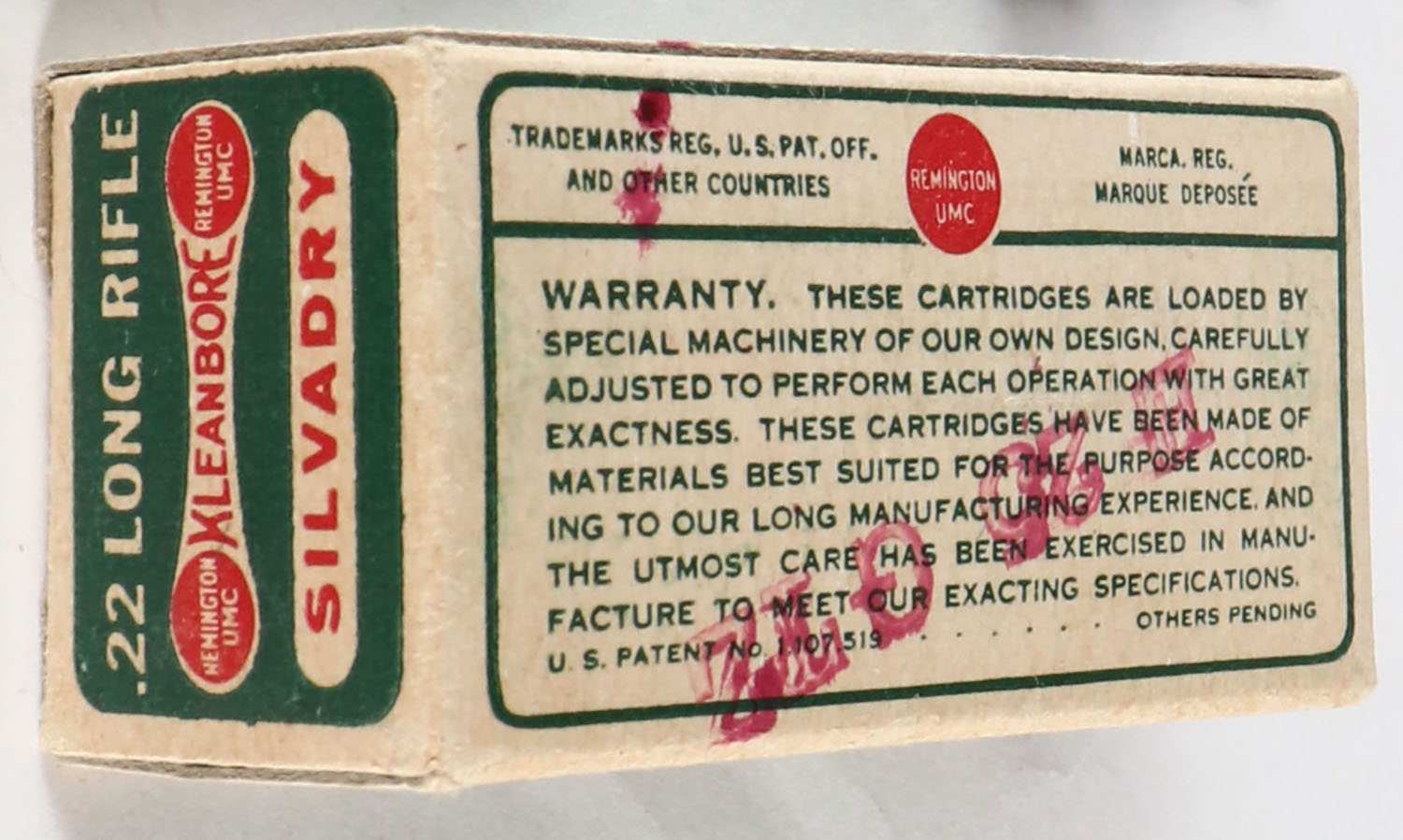 Remington, Silvadry Kleanbore, .22 Long Rifle, RHWeb: 7.3 LR-1, Full, 1pc. Green buff & red dog bone box, box is solid with excellent to minty color, very minor corner wear, edges are crisp, end flaps are solid, ammo is excellent to minty. Grade: Excellent ++ - Value: 20 to 60