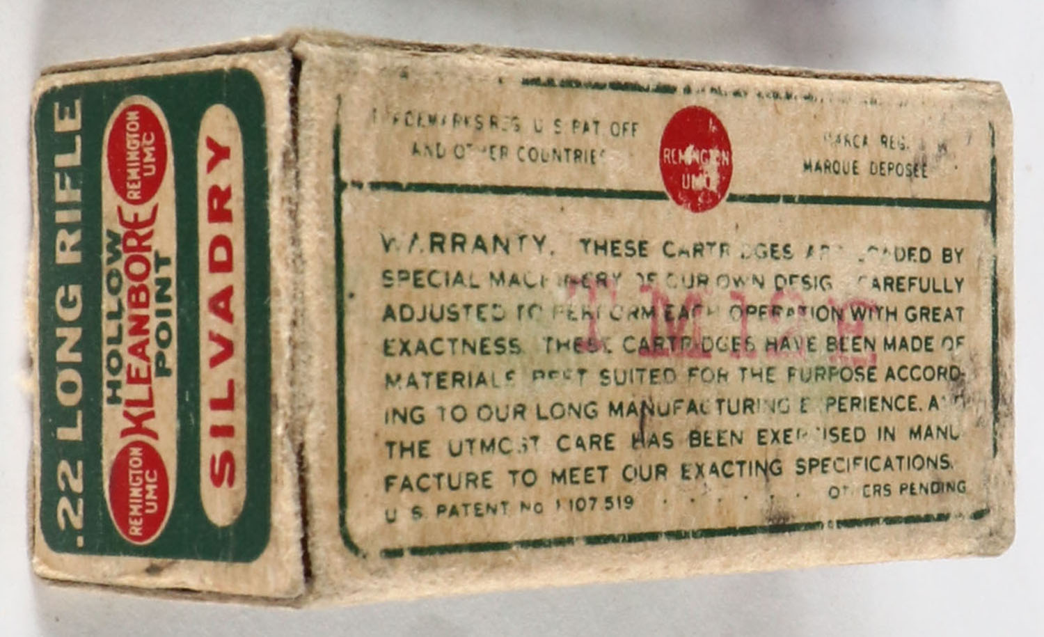 Remington, Silvadry Kleanbore, .22 Long Rifle Hollow Point, RHWeb: REM-7.3 LR-2, Full, 1pc. Green buff & red dog bone box, right end flap is torn, very good to excellent color, very minor age soiling, some shelf & corner wear, minor edge wear, left end flap is solid, ammo is very good. Grade: Very Good + - Value: 40 to 120