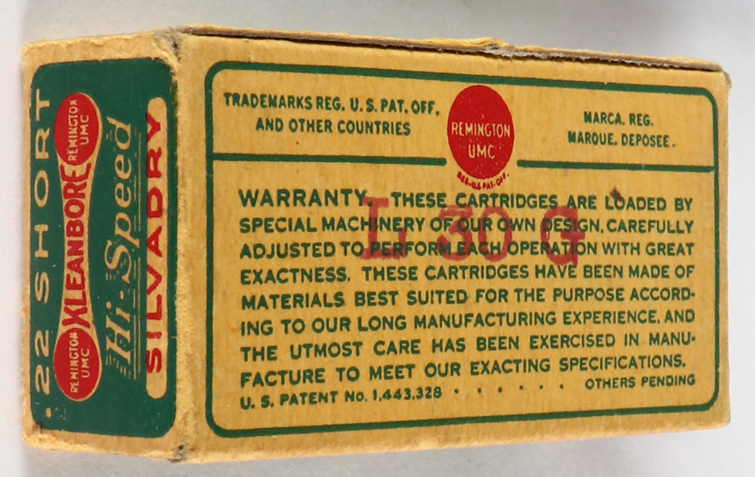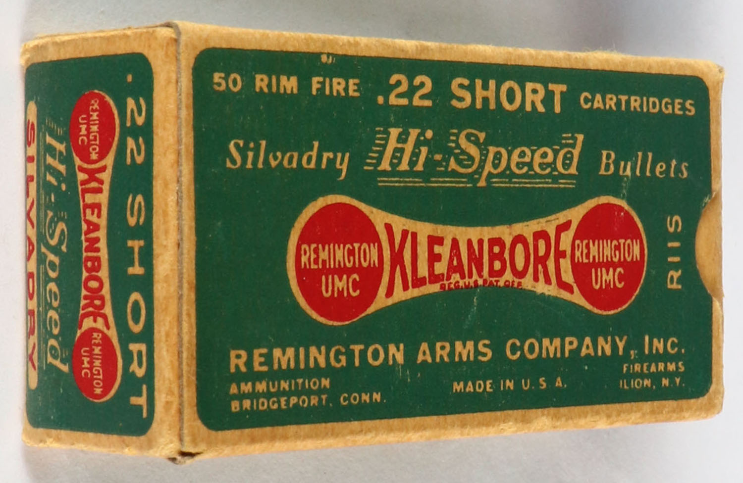 Remington, Silvadry Hi-Speed, .22 Short, RHWeb: REM-7.5 S-1c, Full, 1pc. Green buff & red dog bone box, box is solid with excellent color, very minor age soiling & corner wear, edges are crisp, end flaps are solid, ammo is excellent. Grade: Excellent + - Value: 20 to 60